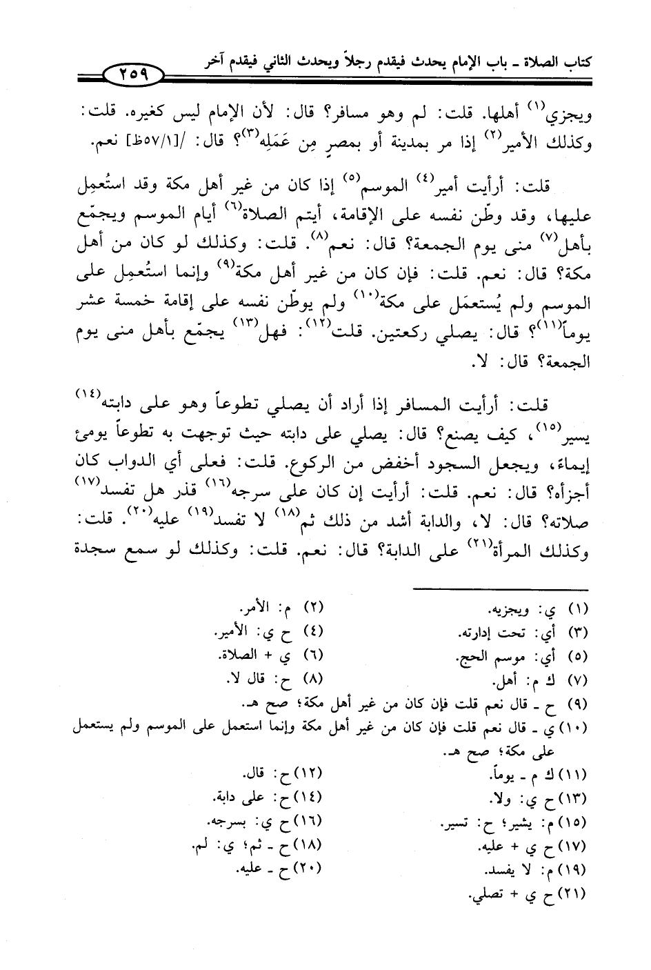 ويجزي (¬1) أهلها. قلت: لم وهو مسافر؟ قال: لأن الإمام ليس كغيره. قلت: وكذلك الأمير (¬2) إذا مر بمدينة أو بمصرِ مِن عَمَلِه (¬3)؟ قال: نعم.