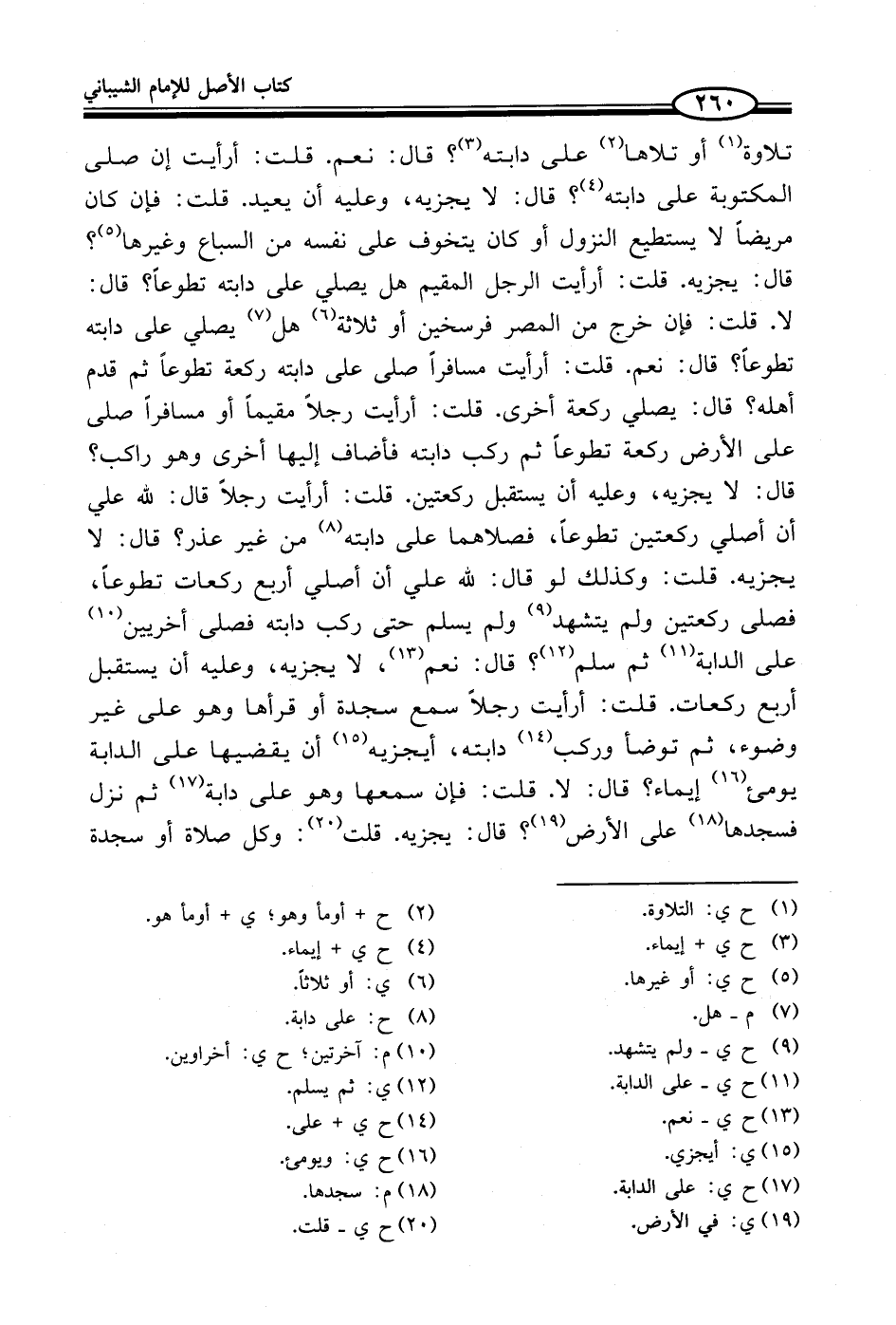 تلاوة (¬1) أو تلاها (¬2) على دابته (¬3)؟ قال: نعم. قلت: أرأيت إن صلى المكتوبة على دابته (¬4)؟ قال: لا يجزيه، وعليه أن يعيد. قلت: فإن كان مريضاً لا يستطيع النزول أو كان يتخوف على نفسه من السباع وغيرها (¬5)؟ قال: يجزيه. قلت: أرأيت الرجل المقيم هل يصلي على دابته تطوعاً؟ قال: لا. قلت: فإن خرج من المصر فرسخين أو ثلاثة (¬6) هل (¬7) يصلي على دابته تطوعاً؟ قال: نعم. قلت: أرأيت مسافراً صلى على دابته ركعة تطوعاً ثم قدم أهله؟ قال: يصلي ركعة أخرى. قلت: أرأيت رجلاً مقيماً أو مسافراً صلى على الأرض ركعة تطوعاً ثم ركب دابته فأضاف إليها أخرى وهو راكب؟ قال: لا يجزيه، وعليه أن يستقبل ركعتين. قلت: أرأيت رجلاً قال: لله علي أن أصلي ركعتين تطوعاً، فصلاهما على دابته (¬8) من غير عذر؟ قال: لا يجزيه. قلت: وكذلك لو قال: لله علي أن أصلي أربع ركعات تطوعاً، فصلى ركعتين ولم يتشهد (¬9) ولم يسلم حتى ركب دابته فصلى أخريين (¬10) على الدابة (¬11) ثم سلم (¬12)؟ قال: نعم (¬13)، لا يجزيه، وعليه أن يستقبل أربع ركعات. قلت: أرأيت رجلاً سمع سجدة أو قرأها وهو على غير وضوء، ثم توضأ وركب (¬14) دابته، أيجزيه (¬15) أن يقضيها على الدابة يومئ (¬16) إيماء؟ قال: لا. قلت: فإن سمعها وهو على دابة (¬17) ثم نزل فسجدها (¬18) على الأرض (¬19)؟ قال: يجزيه. قلت (¬20): وكل صلاة أو سجدة