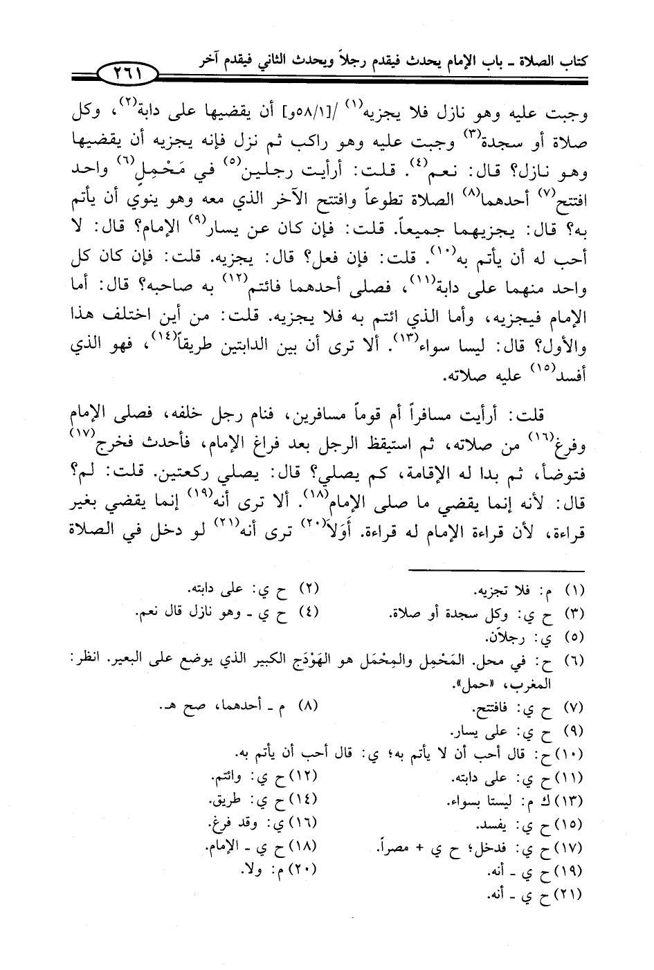 وجبت عليه وهو نازل فلا يجزيه (¬1) أن يقضيها على دابة (¬2)، وكل صلاة أو سجدة (¬3) وجبت عليه وهو راكب ثم نزل فإنه يجزيه أن يقضيها وهو نازل؟ قال: نعم (¬4). قلت: أرأيت رجلين (¬5) في مَحْمِلٍ (¬6) واحد افتتح (¬7) أحدهما (¬8) الصلاة تطوعاً وافتتح الآخر الذي معه وهو ينوي أن يأتم به؟ قال: يجزيهما جميعاً. قلت: فإن كان عن يسار (¬9) الإمام؟ قال: لا أحب له أن يأتم به (¬10). قلت: فإن فعل؟ قال: يجزيه. قلت: فإن كان كل واحد منهما على دابة (¬11)، فصلى أحدهما فائتم (¬12) به صاحبه؟ قال: أما الإمام فيجزيه، وأما الذي ائتم به فلا يجزيه. قلت: من أين اختلف هذا والأول؟ قال: ليسا سواء (¬13). ألا ترى أن بين الدابتين طريقاً (¬14)، فهو الذي أفسد (¬15) عليه صلاته.
