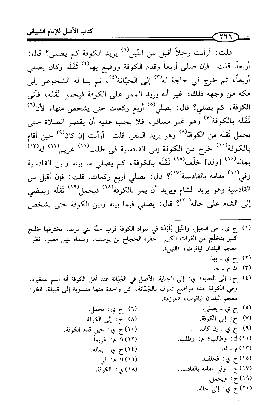 قلت: أرأيت رجلاً أقبل من النِّيل (¬1) يريد الكوفة كم يصلي؟ قال: أربعاً. قلت: فإن صلى أربعاً وقدم الكوفة ووضع بها (¬2) ثَقَلَه وكان يصلي أربعاً، ثم خرج في حاجة له (¬3) إلى الجَبّانة (¬4)، ثم بدا له الشخوص إلى مكة من وجهه ذلك، غير أنه يريد الممر على الكوفة فيحمل ثَقَله، فأتى الكوفة، كم يصلي؟ قال: يصلي (¬5) أربع ركعات حتى يشخص منها، لأن (¬6) ثَقَله بالكوفة (¬7) وهو غير مسافر، فلا يجب عليه أن يقصر الصلاة حتى يحمل ثَقَله من الكوفة (¬8) وهو يريد السفر. قلت: أرأيت إن كان (¬9) حين أقام بالكوفة (¬10) خرج من الكوفة إلى القادسية في طلب (¬11) غريم (¬12) له (¬13) بماله (¬14) [وقد] خلّف (¬15) ثَقَلَه بالكوفة، كم يصلي ما بينه وبين القادسية وفي (¬16) مقامه بالقادسية (¬17)؟ قال: يصلي أربع ركعات. قلت: فإن أقبل من القادسية وهو يريد الشام ويريد أن يمر بالكوفة (¬18) فيحمل (¬19) ثَقَلَه ويمضي إلى الشام على حاله (¬20)؟ قال: يصلي فيما بينه وبين الكوفة حتى يشخص