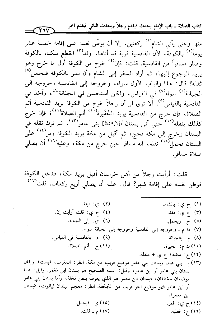 منها وحتى يأتي الشام (¬1) ركعتين، إلا أن يوطّن نفسه على إقامة خمسة عشر يوماً (¬2) بالكوفة، لأن القادسية قرية قد أتاها، وقد (¬3) انقطع سكناه بالكوفة وصار مسافراً من القادسية. قلت: فإن (¬4) خرج من الكوفة أول ما خرج وهو يريد الرجوع إليها، ثم أراد السفر إلى الشام وأن يمر بالكوفة فيحمل (¬5) ثقله؟ قال: هذا والباب الأول سواء، وخروجه إلى القادسية وخروجه إلى الجبانة (¬6) سواء (¬7) في القياس، ولكن أستحسن في الجَبّانة (¬8)، وآخذ في القادسية بالقياس (¬9). ألا ترى لو أن رجلاً خرج من الكوفة يريد القادسية أتم الصلاة، فإن خرج من القادسية يريد الحُفَيرة (¬10) أتم الصلاة (¬11)؛ فإن خرج كذلك بثقله (¬12) حتى أتى بستان بني عامر (¬13)، ثم ترك ثقله في البستان وخرج إلى مكة فحج، ثم أقبل من مكة يريد الكوفة ومر (¬14) على البستان فحمل (¬15) ثقله، أنه مسافر حين خرج من مكة، وعليه (¬16) أن يصلي صلاة مسافر.