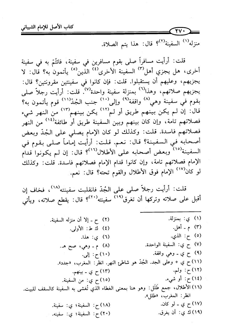 قلت: أرأيت مسافراً صلى بقوم مسافرين في سفينة، فائتُمّ به في سفينة أخرى، هل يجزي أهل (¬3) السفينة الأخرى (¬4) الذين (¬5) يأتمون به؟ قال: لا يجزيهم، وعليهم أن يستقبلوا. قلت: فإن كانوا في سفينتين مقرونتين؟ قال: يجزيهم صلاتهم، وهذا (¬6) بمنزلة سفينة واحدة (¬7). قلت: أرأيت رجلاً صلى بقوم في سفينة وهي (¬8) واقفة (¬9) وإلى (¬10) جنب الجُدّ (¬11) قوم يأتمون به؟ قال: إن لم يكن بينهم طريق أو لم (¬12) يكن بينهم (¬13) من النهر شيء فصلاتهم تامة، وإن كان بينهم وبين السفينة طريق أو طائفة (¬14) من النهر فصلاتهم فاسدة. قلت: وكذلك لو كان الإمام يصلي على الجُدّ وبعض أصحابه في السفينة؟ قال: نعم. قلت: أرأيت إماماً صلى بقوم في السفينة (¬15) وبعض أصحابه على الأطلال (¬16)؟ قال: إن لم يكونوا قدام الإمام فصلاتهم تامة، وإن كانوا قدام الإمام فصلاتهم فاسدة. قلت: وكذلك لو كان (¬17) الإمام فوق الأطلال والقوم تحته؟ قال: نعم.