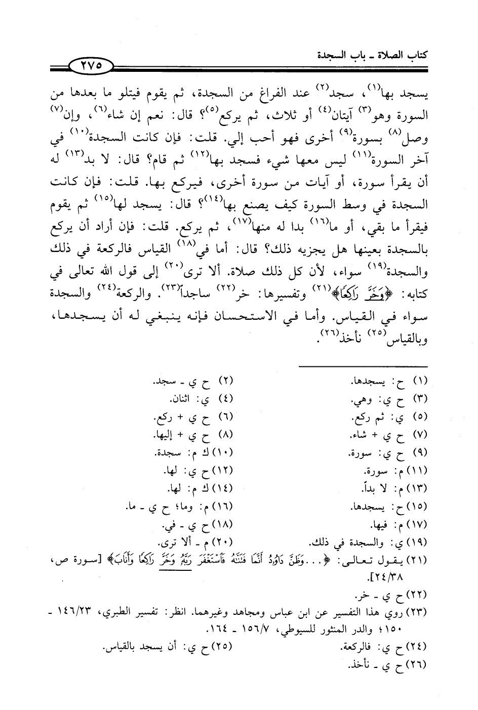 يسجد بها (¬1)، سجد (¬2) عند الفراغ من السجدة، ثم يقوم فيتلو ما بعدها من السورة وهو (¬3) آيتان (¬4) أو ثلاث، ثم يركع (¬5)؟ قال: نعم إن شاء (¬6)، وإن (¬7) وصل (¬8) بسورة (¬9) أخرى فهو أحب إلي. قلت: فإن كانت السجدة (¬10) في آخر السورة (¬11) ليس معها شيء فسجد بها (¬12) ثم قام؟ قال: لا بد (¬13) له أن يقرأ سورة، أو آيات من سورة أخرى، فيركع بها. قلت: فإن كانت السجدة في وسط السورة كيف يصنع بها (¬14)؟ قال: يسجد لها (¬15) ثم يقوم فيقرأ ما بقي، أو ما (¬16) بدا له منها (¬17)، ثم يركع. قلت: فإن أراد أن يركع بالسجدة بعينها هل يجزيه ذلك؟ قال: أما في (¬18) القياس فالركعة في ذلك والسجدة (¬19) سواء، لأن كل ذلك صلاة. ألا ترى (¬20) إلى قول الله تعالى في كتابه: {وَخَرَّ رَاكِعًا} (¬21) وتفسيرها: خر (¬22) ساجداً (¬23). والركعة (¬24) والسجدة سواء في القياس. وأما في الاستحسان فإنه ينبغي له أن يسجدها، وبالقياس (¬25) نأخذ (¬26).