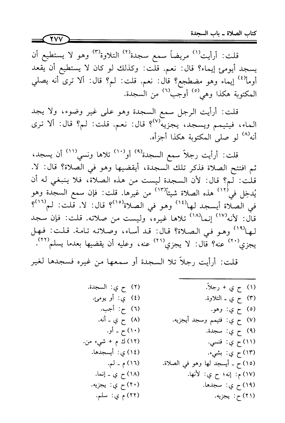 قلت: أرأيت رجلاً سمع السجدة (¬9) أو (¬10) تلاها ونسي (¬11) أن يسجد، ثم افتتح الصلاة فذكر تلك السجدة، أيقضيها وهو في الصلاة؟ قال: لا. قلت: لم؟ قال: لأن السجدة ليست من هذه الصلاة، فلا ينبغي له أن يُدخِل في (¬12) هذه الصلاة شيئاً (¬13) من غيرها. قلت: فإن سمع السجدة وهو في الصلاة أيسجد لها (¬14) وهو في الصلاة (¬15)؟ قال: لا. قلت: لم (¬16)؟ قال: لأنه (¬17) إنما (¬18) تلاها غيره، وليست من صلاته. قلت: فإن سجد لها (¬19) وهو في الصلاة؟ قال: قد أساء، وصلاته تامة. قلت: فهل يجزي (¬20) عنه؟ قال: لا يجزي (¬21) عنه، وعليه أن يقضيها بعدما يسلم (¬22).