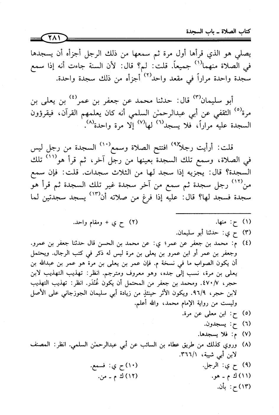 أبو سليمان (¬3) قال: حدثنا محمد عن جعفر بن عمر (¬4) بن يعلى بن مرة (¬5) الثقفي عن أبي عبدالرحمن السلمي أنه كان يعلمهم القرآن، فيقرؤون السجدة عليه مراراً، فلا يسجد (¬6) لها (¬7) إلا مرة واحدة (¬8).