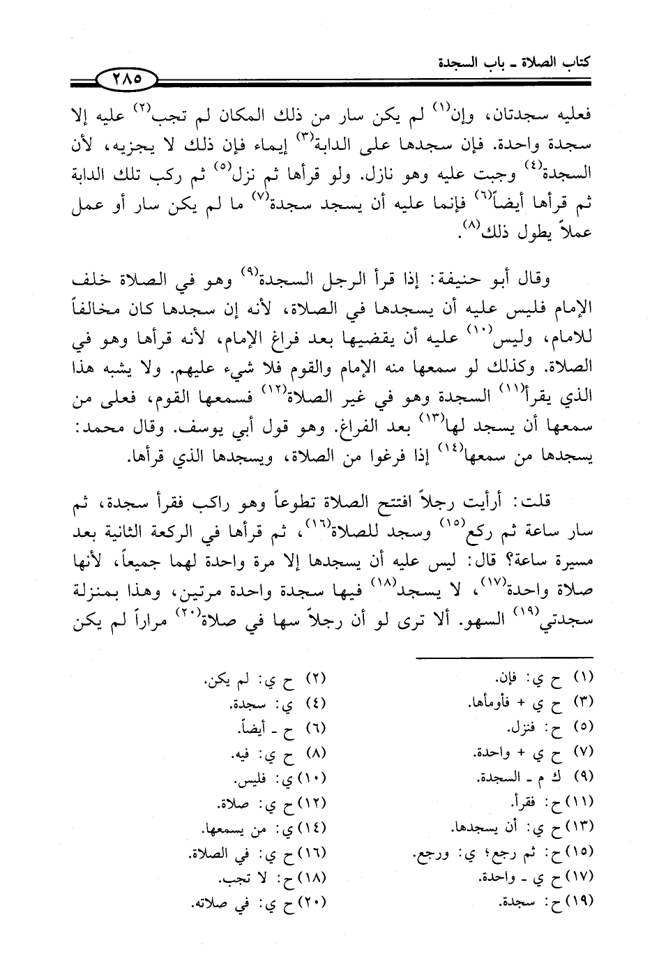 قلت: أرأيت رجلاً افتتح الصلاة تطوعاً وهو راكب فقرأ سجدة، ثم سار ساعة ثم ركع (¬15) وسجد للصلاة (¬16)، ثم قرأها في الركعة الثانية بعد مسيرة ساعة؟ قال: ليس عليه أن يسجدها إلا مرة واحدة لهما جميعاً، لأنها صلاة واحدة (¬17)، لا يسجد (¬18) فيها سجدة واحدة مرتين، وهذا بمنزلة سجدتي (¬19) السهو. ألا ترى لو أن رجلاً سها في صلاة (¬20) مراراً لم يكن