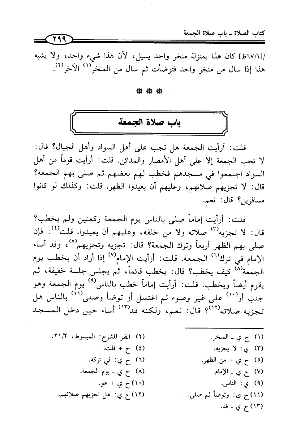 قلت: أرأيت الجمعة هل تجب على أهل السواد وأهل الجبال؟ قال: لا تجب الجمعة إلا على أهل الأمصار والمدائن. قلت: أرأيت قوماً من أهل السواد اجتمعوا في مسجدهم فخطب لهم بعضهم ثم صلى بهم الجمعة؟ قال: لا تجزيهم صلاتهم، وعليهم أن يعيدوا الظهر. قلت: وكذلك لو كانوا مسافرين؟ قال: نعم.