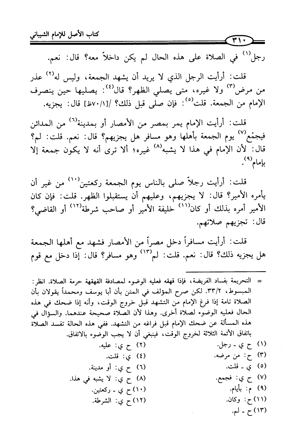 قلت: أرأيت مسافراً دخل مصراً من الأمصار فشهد مع أهلها الجمعة هل يجزيه ذلك؟ قال: نعم. قلت: لم (¬13) وهو مسافر؟ قال: إذا دخل مع قوم