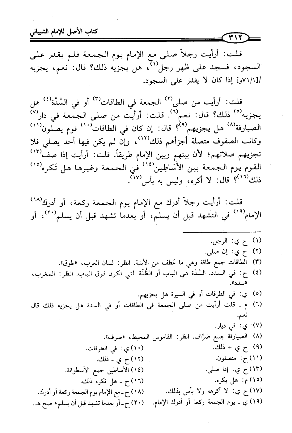 قلت: أرأيت من صلى (¬2) الجمعة في الطاقات (¬3) أو في السُّدَّة (¬4) هل يجزيه (¬5) ذلك؟ قال: نعم (¬6). قلت: أرأيت من صلى الجمعة في دار (¬7) الصيارفة (¬8) هل يجزيهم (¬9)؟ قال: إن كان في الطاقات (¬10) قوم يصلون (¬11) وكانت الصفوف متصلة أجزأهم ذلك (¬12)، وإن لم يكن فيها أحد يصلي فلا تجزيهم صلاتهم؛ لأن بينهم وبين الإمام طريقاً. قلت: أرأيت إذا صف (¬13) القوم يوم الجمعة بين الأَسَاطِين (¬14) في الجمعة وغيرها هل تَكره (¬15) ذلك (¬16)؟ قال: لا أكره، وليس به بأس (¬17).