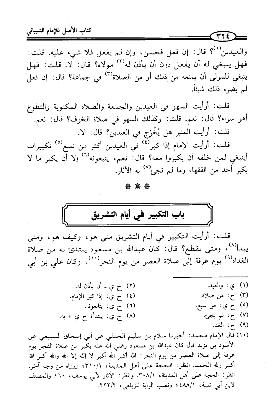 (¬10) قال الإمام محمد: أخبرنا سلام بن سليم الحنفي عن أبي إسحاق السبيعي عن الأسود بن يزيد قال كان عبد الله بن مسعود - رضي الله عنه - يكبر من صلاة الفجر يوم عرفة إلى صلاة العصر من يوم النحر: الله أكبر الله أكبر لا إله إلا الله والله أكبر الله أكبر ولله الحمد. انظر: الحجة على أهل المدينة، 1/ 310؛ ورواه من وجه آخر. انظر: الحجة على أهل المدينة، 1/ 308. وانظر: الآثار لأبي يوسف، 60؛ والمصنف لابن أبي شيبة، 1/ 488؛ ونصب الراية للزيلعي، 2/ 222.