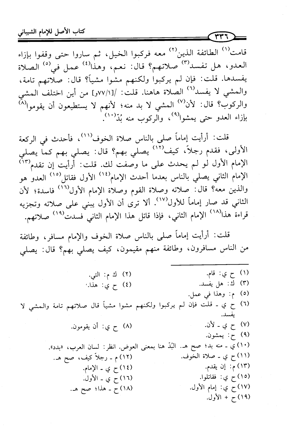 قامت (¬1) الطائفة الذين (¬2) معه فركبوا الخيل، ثم ساروا حتى وقفوا بإزاء العدو، هل تفسد (¬3) صلاتهم؟ قال: نعم، وهذا (¬4) عمل في (¬5) الصلاة يفسدها. قلت: فإن لم يركبوا ولكنهم مشوا مشياً؟ قال: صلاتهم تامة، والمشي لا يفسد (¬6) الصلاة هاهنا. قلت: من أين اختلف المشي والركوب؟ قال: لأن (¬7) المشي لا بد منه؛ لأنهم لا يستطيعون أن يقوموا (¬8) بإزاء العدو حتى يمشوا (¬9)، والركوب منه بُدّ (¬10).