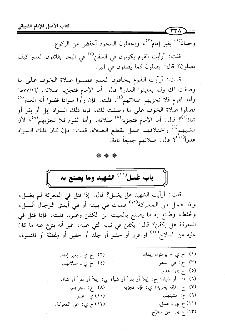 قلت: أرأيت القوم يخافون العدو فصلوا صلاة الخوف على ما وصفت لك ولم يعاينوا العدو؟ قال: أما الإِمام فتجزيه صلاته، وأما القوم فلا تجزيهم صلاتهم (¬4). قلت: فإن رأوا سوادا فظنوا أنه العدو (¬5) فصلوا صلاة الخوف على ما وصفت لك، فإذا ذلك السواد إبل أو بقر أو شاة (¬6)؟ قال: أما الإِمام فتجزيه (¬7) صلاته، وأما القوم فلا تجزيهم (¬8)؛ لأن مشيهم (¬9) واختلافهم عمل يقطع الصلاة. قلت: فإن كان ذلك السواد عدواً (¬10)؟ قال: صلاتهم جميعاً تامة.
