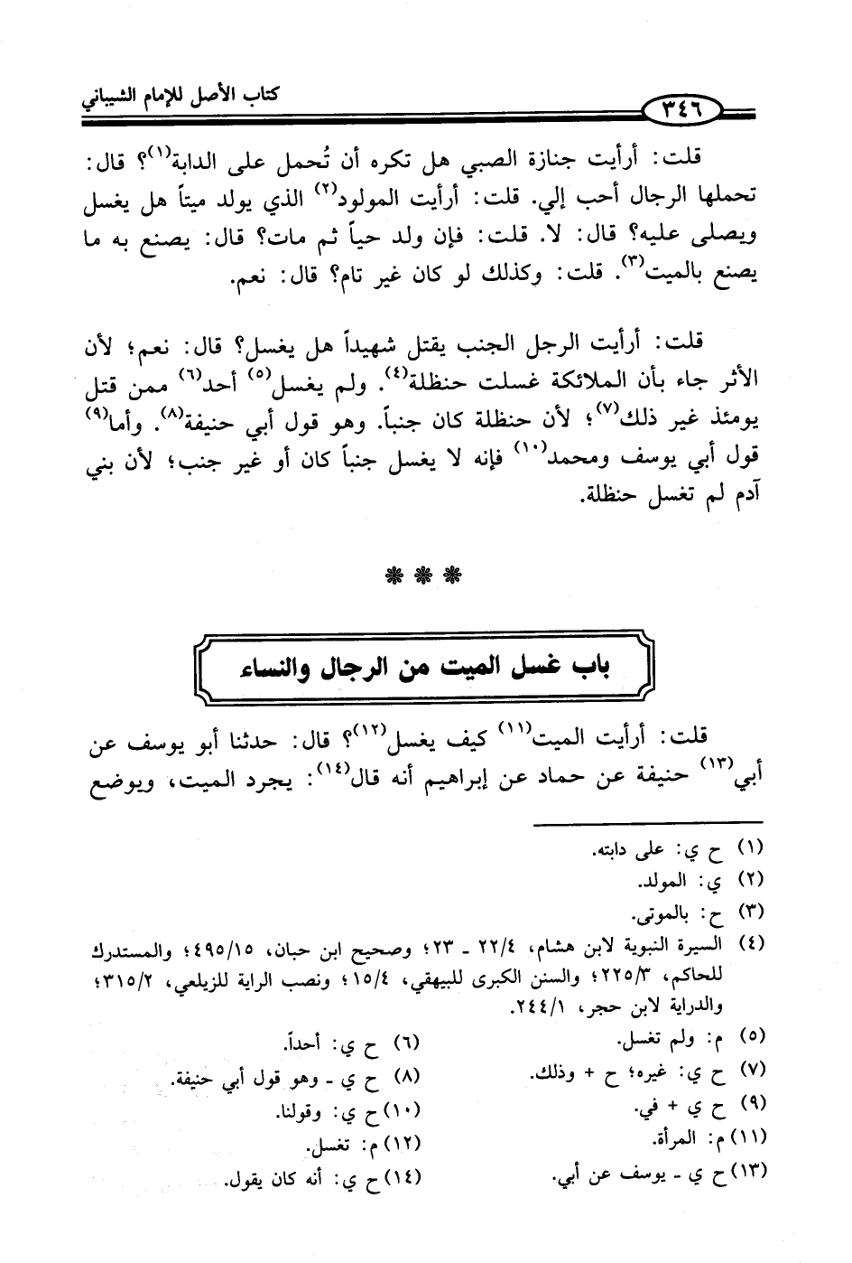 قلت: أرأيت الرجل الجنب يقتل شهيداً هل يغسل؟ قال: نعم؛ لأن الأثر جاء بأن الملائكة غسلت حنظلة (¬4). ولم يغسل (¬5) أحد (¬6) ممن قتل يومئذ غير ذلك (¬7)؛ لأن حنظلة كان جنباً. وهو قول أبي حنيفة (¬8). وأما (¬9) قول أبي يوسف ومحمد (¬10) فإنه لا يغسل جنباً كان أو غير جنب؛ لأن بني آدم لم تغسل حنظلة.