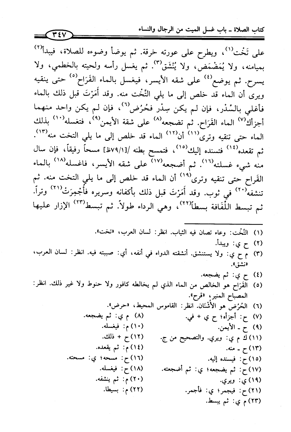 على تَخْت (¬1)، ويطرح على عورته خرقة. ثم يوضأ وضوءه للصلاة، فيبدأ (¬2) بميامنه، ولا يُمَضْمَض، ولا يُنْشَق (¬3). ثم يغسل رأسه ولحيته بالخطمي، ولا يسرح. ثم يوضع (¬4) على شقه الأيسر، فيغسل بالماء القَرَاح (¬5) حتى ينقيه ويرى أن الماء قد خلص إلى ما يلي التَّخْت منه. وقد أَمَرْتَ قبل ذلك بالماء فأغلي بالسدْر، فإن لم يكن سِدْر فحُرُض (¬6)، فإن لم يكن واحد منهما أجزأك (¬7) الماء القَرَاح. ثم تضجعه (¬8) على شقة الأيمن (¬9)، فتغسله (¬10) بذلك الماء حتى تنقيه وترى (¬11) أن (¬12) الماء قد خلص إلى ما يلي التخت منه (¬13). ثم تقعده (¬14) فتسنده إليك (¬15)، فتمسح بطنه مسحاً رفيقاً، فإن سال منه شيء غسلته (¬16). ثم أضجعه (¬17) على شقه الأيسر، فاغسله (¬18) بالماء القَراح حتى تنقيه وترى (¬19) أن الماء قد خلص إلى ما يلي التخت منه. ثم تنشفه (¬20) في ثوب. وقد أَمَرْتَ قبل ذلك بأكفانه وسريره فأُجْمِرَتْ (¬21) وتراً. ثم تبسط اللِّفَافة بسطًا (¬22)، وهي الرداء طولاً. ثم تبسط (¬23) الإزار عليها
