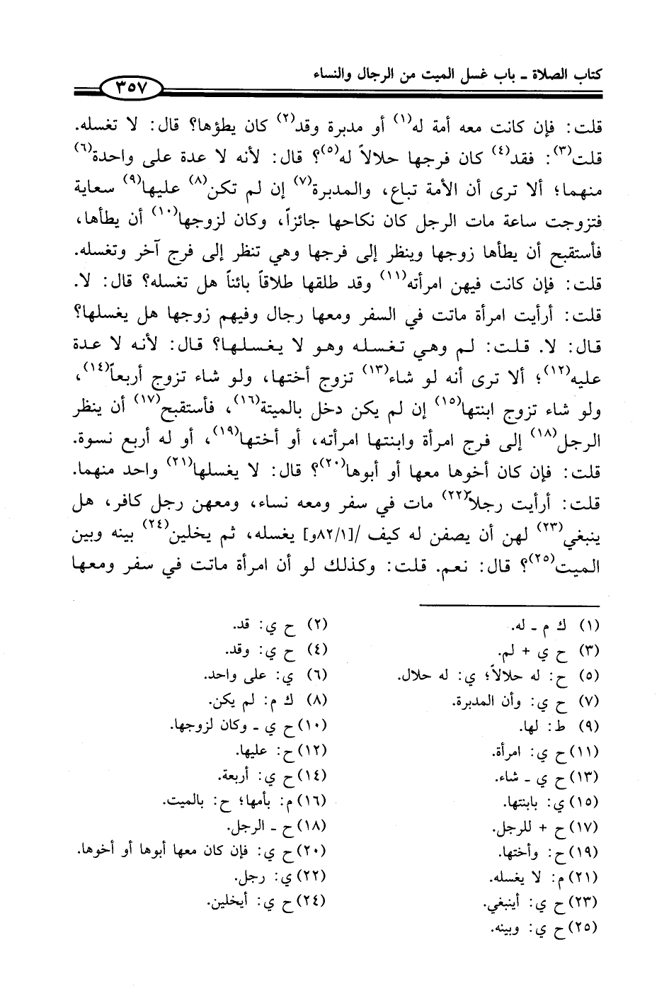 قلت: فإن كانت معه أمة له (¬1) أو مدبرة وقد (¬2) كان يطؤها؟ قال: لا تغسله. قلت (¬3): فقد (¬4) كان فرجها حلالاً له (¬5)؟ قال: لأنه لا عدة على واحدة (¬6) منهما؛ ألا ترى أن الأمة تباع، والمدبرة (¬7) إن لم تكن (¬8) عليها (¬9) سعاية فتزوجت ساعة مات الرجل كان نكاحها جائزاً، وكان لزوجها (¬10) أن يطأها، فأستقبح أن يطأها زوجها وينظر إلى فرجها وهي تنظر إلى فرج آخر وتغسله. قلت: فإن كانت فيهن امرأته (¬11) وقد طلقها طلاقاً بائناً هل تغسله؟ قال: لا. قلت: أرأيت امرأة ماتت في السفر ومعها رجال وفيهم زوجها هل يغسلها؟ قال: لا. قلت: لم وهي تغسله وهو لا يغسلها؟ قال: لأنه لا عدة عليه (¬12)؛ ألا ترى أنه لو شاء (¬13) تزوج أختها, ولو شاء تزوج أربعاً (¬14)، ولو شاء تزوج ابنتها (¬15) إن لم يكن دخل بالميتة (¬16)، فأستقبح (¬17) أن ينظر الرجل (¬18) إلى فرج امرأة وابنتها امرأته، أو أختها (¬19)، أو له أربع نسوة. قلت: فإن كان أخوها معها أو أبوها (¬20)؟ قال: لا يغسلها (¬21) واحد منهما. قلت: أرأيت رجلاً (¬22) مات في سفر ومعه نساء، ومعهن رجل كافر، هل ينبغي (¬23) لهن أن يصفن له كيف يغسله، ثم يخلين (¬24) بينه وبين الميت (¬25)؟ قال: نعم. قلت: وكذلك لو أن امرأة ماتت في سفر ومعها