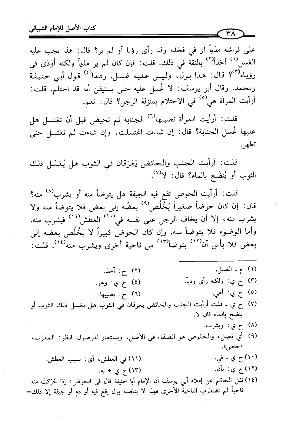 على فراشه مذياً أو في فخذه وقد رأى رؤيا أو لم ير؟ قال: هذا يجب عليه الغسل (¬1) أخذاً (¬2) بالثقة في ذلك. قلت: فإن كان لم ير مذياً ولكنه أَوْدَى في رؤياه (¬3)؟ قال: هذا بول، وليس عليه غسل. وهذا (¬4) قول أبي حنيفة ومحمد. وقال أبو يوسف: لا غُسل عليه حتى يستيقن أنه قد احتلم. قلت: أرأيت المرأة هي (¬5) في الاحتلام بمنزلة الرجل؟ قال: نعم.