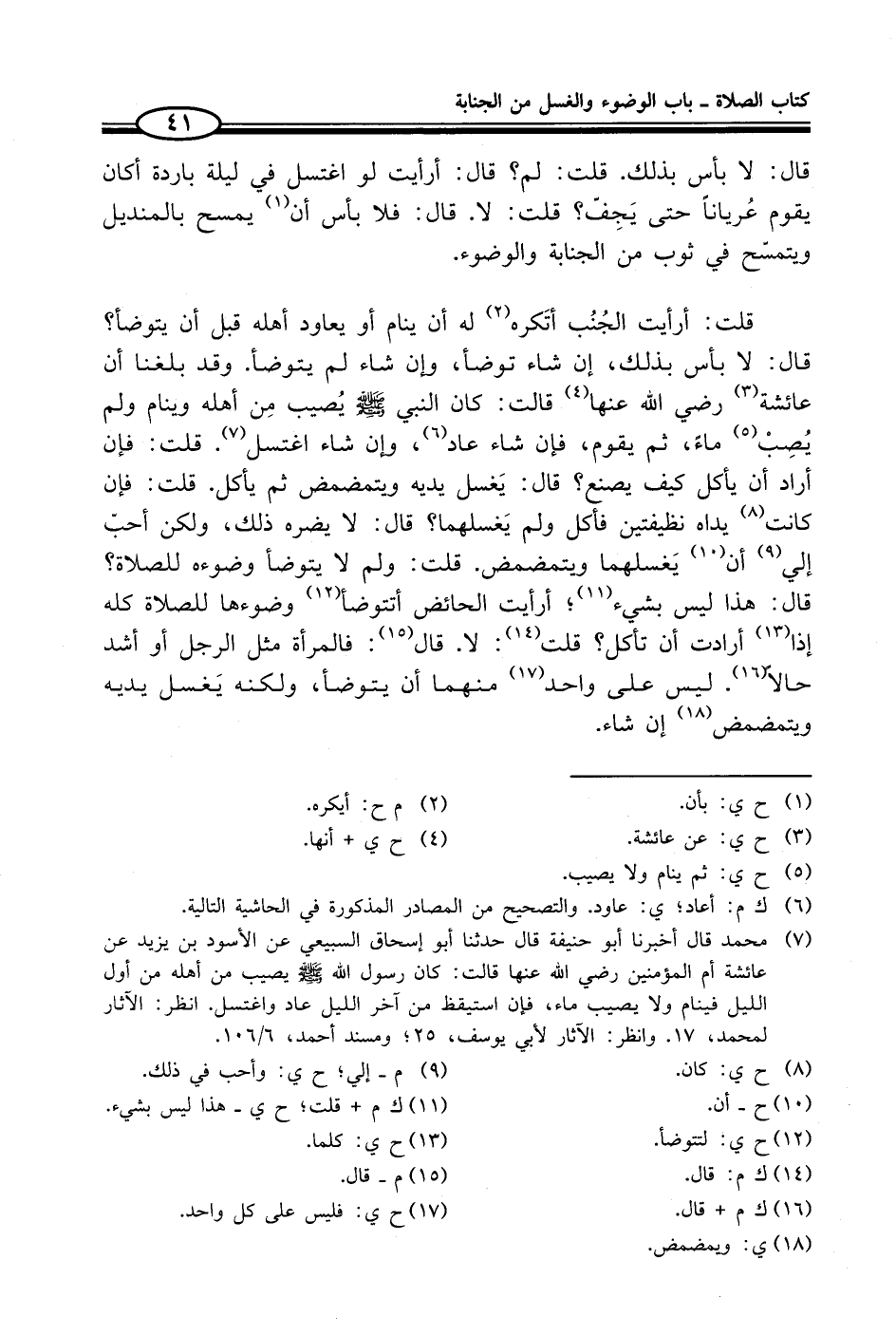 (¬7) محمد قال أخبرنا أبو حنيفة قال حدثنا أبو إسحاق السبيعي عن الأسود بن يزيد عن عائشة أم المؤمنين رضي الله عنها قالت: كان رسول الله - صلى الله عليه وسلم - يصيب من أهله من أول الليل فينام ولا يصيب ماء، فإن استيقظ من آخر الليل عاد واغتسل. انظر: الآثار لمحمد، 17. وانظر: الآثار لأبي يوسف، 25؛ ومسند أحمد، 6/ 106.