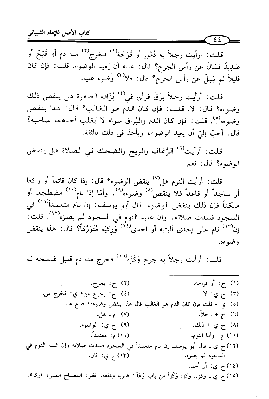 قلت: أرأيت النوم هل (¬7) ينقض الوضوء؟ قال: إذا كان قائماً أو راكعاً أو ساجداً أو قاعداً فلا ينقض (¬8) وضوءه (¬9)، وأمّا إذا نام (¬10) مضطجعاً أو متكئاً فإن ذلك ينقض الوضوء. قال أبو يوسف: إن نام متعمداً (¬11) في السجود فسدت صلاته، وإن غلبه النوم في السجود لم يضرّه (¬12). قلت: إن (¬13) نام على إحدى أليتيه أو إحدى (¬14) وَرِكَيْه مُتَوَرِّكاً؟ قال: هذا ينقض وضوءه.