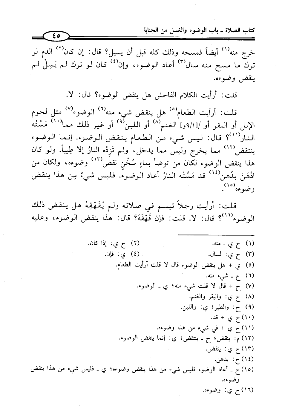 (¬5) ي+ هل ينقض الوضوء قال لا قلت أرأيت الطعام.