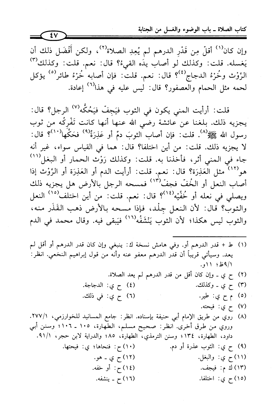 (¬1) ط+ قدر الدرهم أو. وفي هامش نسخة ك: ينبغي وإن كان قدر الدرهم أو أقل لم يعد. وسيأتي قريباً أن قدر الدرهم معفو عنه وأنه من قول إبراهيم النخعي. انظر: 1/ 9 ظ؛ 11 و.