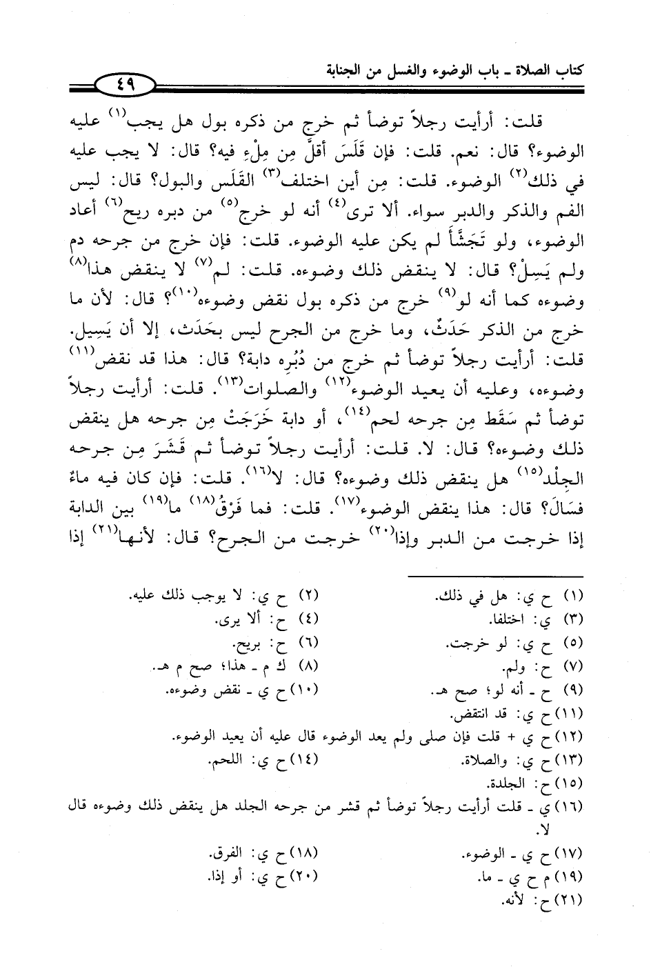 (¬16) ي - قلت أرأيت رجلاً توضأ ثم قشر من جرحه الجلد هل ينقض ذلك وضوءه قال لا.