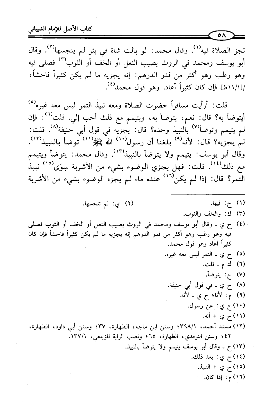 (¬4) ح ي - وقال أبو يوسف ومحمد في الروث يصيب النعل أو الخف أو الثوب فصلى فيه وهو رطب وهو أكثر من قدر الدرهم إنه يجزيه ما لم يكن كثيراً فاحشاً فإن كان كثيراً أعاد وهو قول محمد.