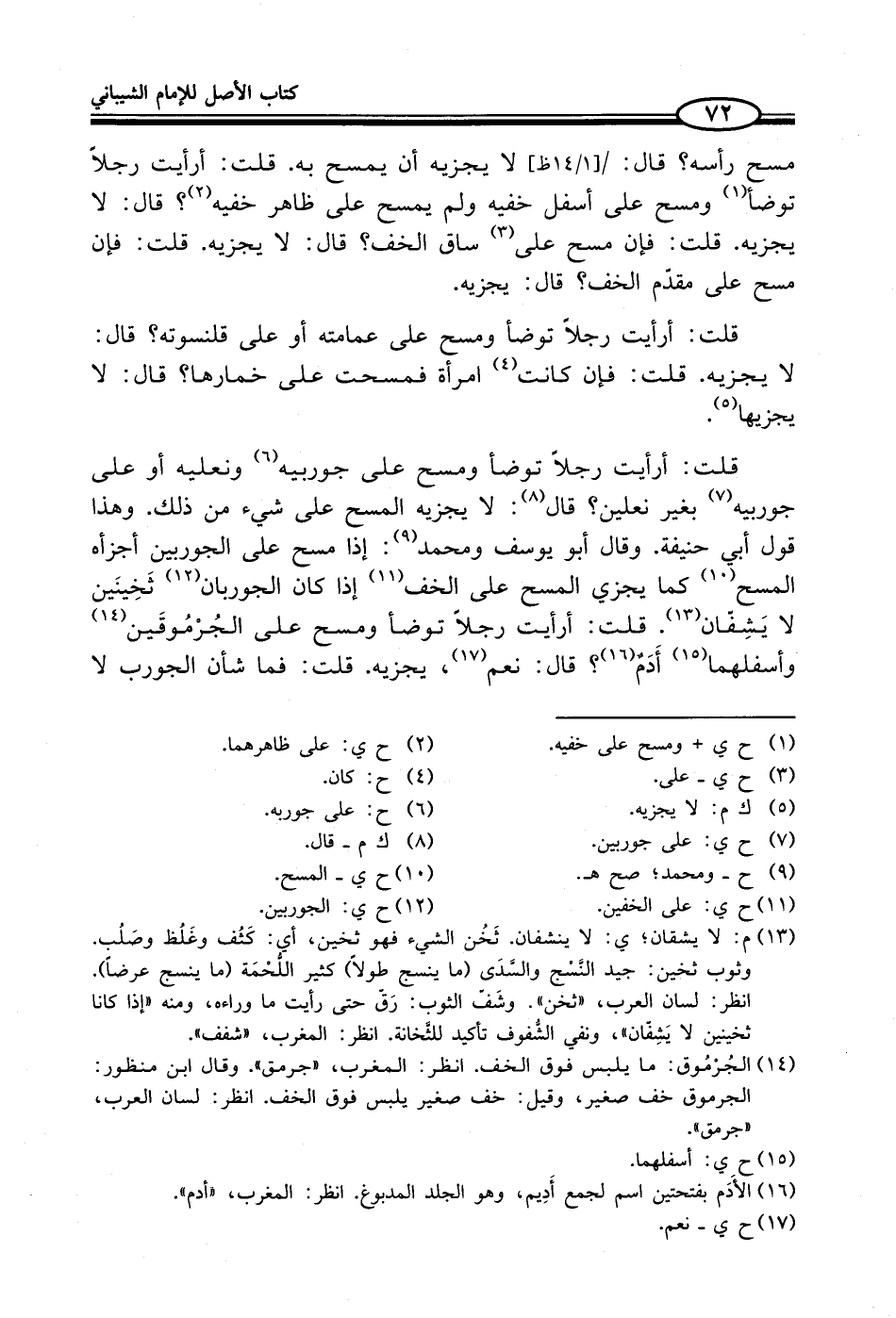 (¬14) الجُرْمُوق: ما يلبس فوق الخف. انظر: المغرب، "جرمق". وقال ابن منظور: الجرموق خف صغير، وقيل: خف صغير يلبس فوق الخف. انظر: لسان العرب، "جرمق".