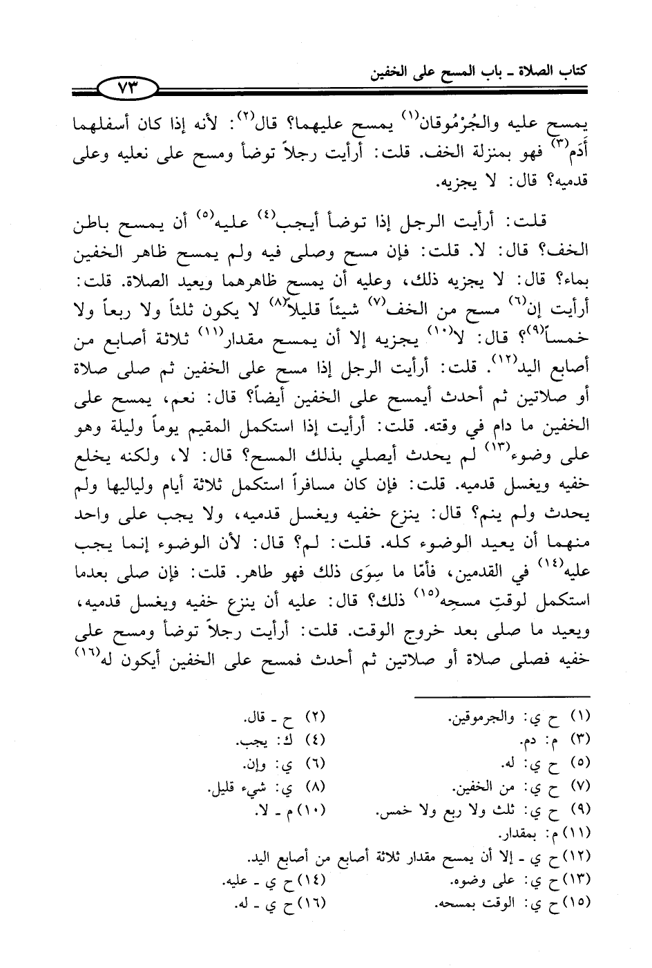 قلت: أرأيت الرجل إذا توضأ أيجب (¬4) عليه (¬5) أن يمسح باطن الخف؟ قال: لا. قلت: فإن مسح وصلى فيه ولم يمسح ظاهر الخفين بماء؟ قال: لا يجزيه ذلك، وعليه أن يمسح ظاهرهما ويعيد الصلاة. قلت: أرأيت إن (¬6) مسح من الخف (¬7) شيئاً قليلاً (¬8) لا يكون ثلثاً ولا ربعاً ولا خمساً (¬9)؟ قال: لا (¬10) يجزيه إلا أن يمسح مقدار (¬11) ثلاثة أصابع من أصابع اليد (¬12). قلت: أرأيت الرجل إذا مسح على الخفين ثم صلى صلاة أو صلاتين ثم أحدث أيمسح على الخفين أيضاً؟ قال: نعم، يمسح على الخفين ما دام في وقته. قلت: أرأيت إذا استكمل المقيم يوماً وليلة وهو على وضوء (¬13) لم يحدث أيصلي بذلك المسح؟ قال: لا، ولكنه يخلع خفيه ويغسل قدميه. قلت: فإن كان مسافراً استكمل ثلاثة أيام ولياليها ولم يحدث ولم ينم؟ قال: ينزع خفيه ويغسل قدميه، ولا يجب على واحد منهما أن يعيد الوضوء كله. قلت: لم؟ قال: لأن الوضوء إنما يجب عليه (¬14) في القدمين، فأمّا ما سِوَى ذلك فهو طاهر. قلت: فإن صلى بعدما استكمل لوقتِ مسحِه (¬15) ذلك؟ قال: عليه أن ينزع خفيه ويغسل قدميه، ويعيد ما صلى بعد خروج الوقت. قلت: أرأيت رجلاً توضأ ومسح على خفيه فصلى صلاة أو صلاتين ثم أحدث فمسح على الخفين أيكون له (¬16)