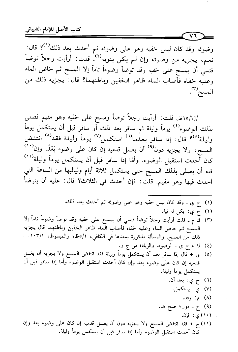 (¬11) ح + فقد انتقض المسح ولا يجزيه دون أن يغسل قدميه إن كان على وضوء بعد وإن كان أحدث استقبل الوضوء وأما إذا سافر قبل أن يستكمل يوماً وليلة.