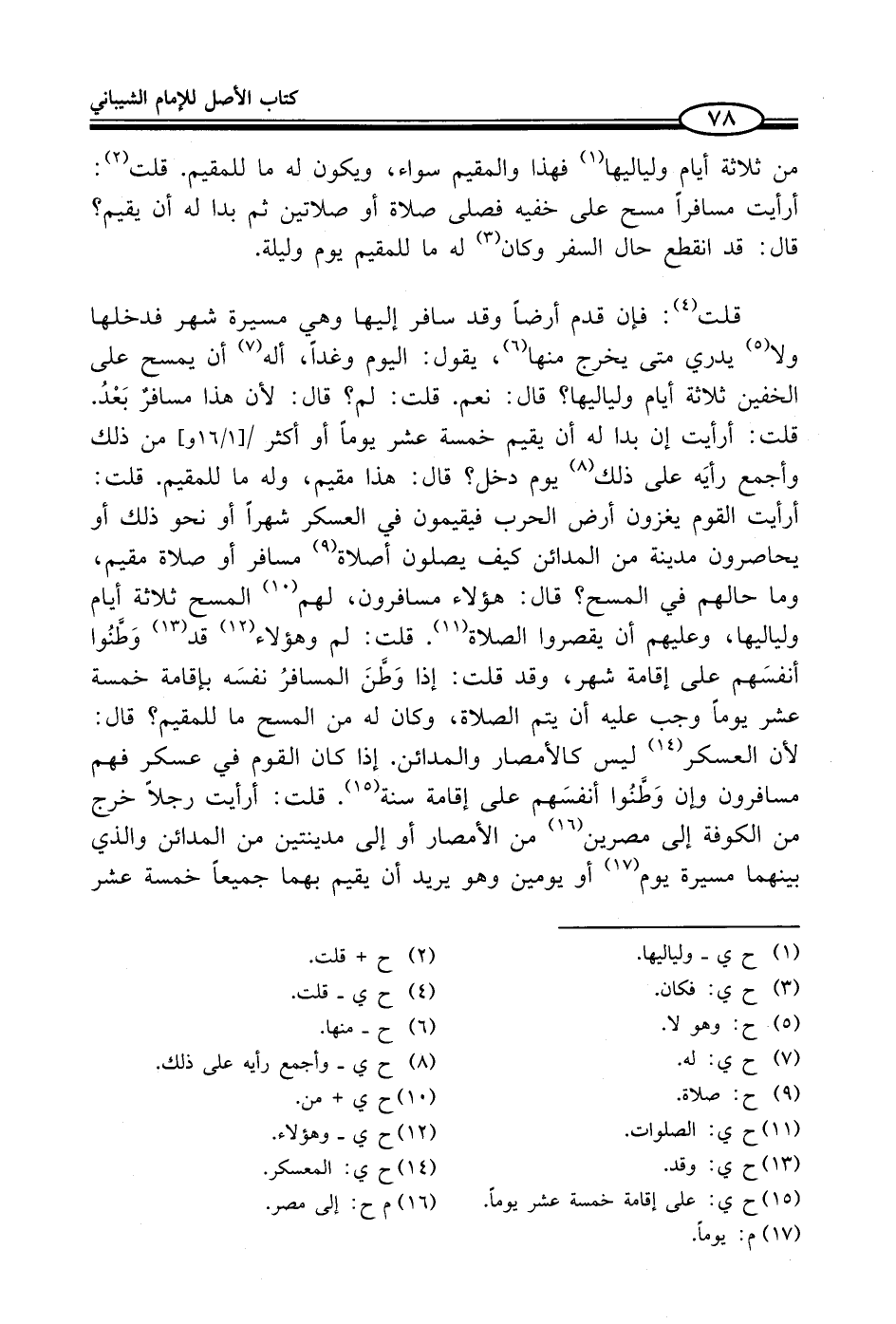 قلت (¬4): فإن قدم أرضاً وقد سافر إليها وهي مسيرة شهر فدخلها ولا (¬5) يدري متى يخرج منها (¬6)، يقول: اليوم وغداً، أله (¬7) أن يمسح على الخفين ثلاثة أيام ولياليها؟ قال: نعم. قلت: لم؟ قال: لأن هذا مسافرٌ بَعْدُ. قلت: أرأيت إن بدا له أن يقيم خمسة عشر يوماً أو أكثر من ذلك وأجمع رأيَه على ذلك (¬8) يوم دخل؟ قال: هذا مقيم، وله ما للمقيم. قلت: أرأيت القوم يغزون أرض الحرب فيقيمون في العسكر شهراً أو نحو ذلك أو يحاصرون مدينة من المدائن كيف يصلون أصلاة (¬9) مسافر أو صلاة مقيم، وما حالهم في المسح؟ قال: هؤلاء مسافرون، لهم (¬10) المسح ثلاثة أيام ولياليها، وعليهم أن يقصروا الصلاة (¬11). قلت: لم وهؤلاء (¬12) قد (¬13) وَطَّنُوا أنفسَهم على إقامة شهر، وقد قلت: إذا وَطَنَ المسافرُ نفسَه بإقامة خمسة عشر يوماً وجب عليه أن يتم الصلاة، وكان له من المسح ما للمقيم؟ قال: لأن العسكر (¬14) ليس كالأمصار والمدائن. إذا كان القوم في عسكر فهم مسافرون وإن وَطَّنُوا أنفسَهم على إقامة سنة (¬15). قلت: أرأيت رجلاً خرج من الكوفة إلى مصرين (¬16) من الأمصار أو إلى مدينتين من المدائن والذي بينهما مسيرة يوم (¬17) أو يومين وهو يريد أن يقيم بهما جميعاً خمسة عشر