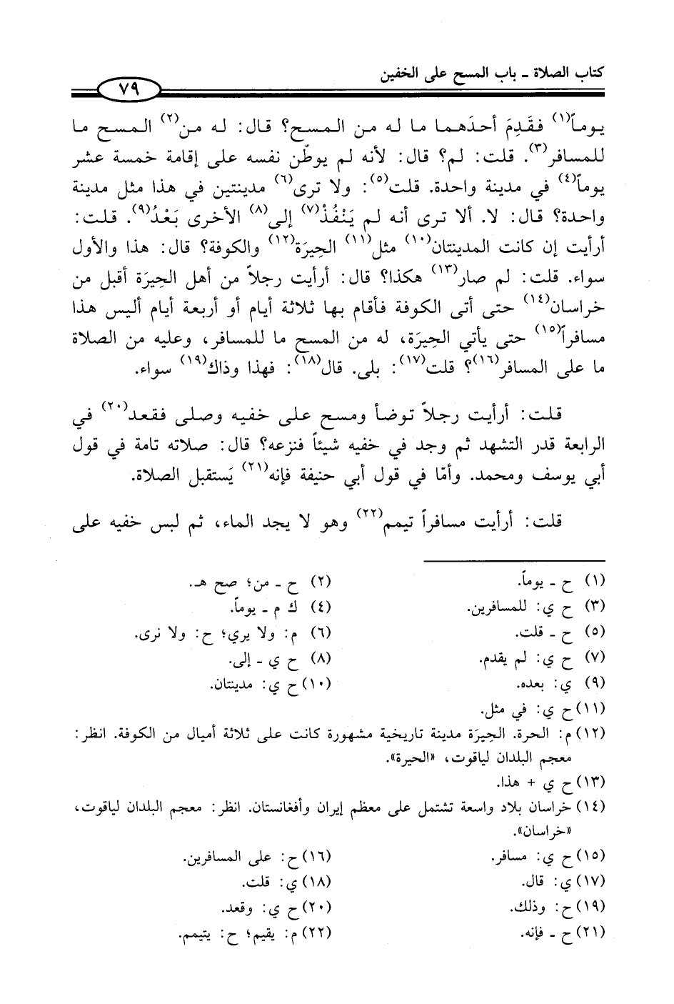يوماً (¬1) فقَدِمَ أحدَهما ما له من المسح؟ قال: له من (¬2) المسح ما للمسافر (¬3). قلت: لم؟ قال: لأنه لم يوطّن نفسه على إقامة خمسة عشر يوماً (¬4) في مدينة واحدة. قلت (¬5): ولا ترى (¬6) مدينتين في هذا مثل مدينة واحدة؟ قال: لا. ألا ترى أنه لم يَنْفُذْ (¬7) إلى (¬8) الأخرى بَعْدُ (¬9). قلت: أرأيت إن كانت المدينتان (¬10) مثل (¬11) الحِيرَة (¬12) والكوفة؟ قال: هذا والأول سواء. قلت: لم صار (¬13) هكذا؟ قال: أرأيت رجلاً من أهل الحِيرَة أقبل من خراسان (¬14) حتى أتى الكوفة فأقام بها ثلاثة أيام أو أربعة أيام أليس هذا مسافراً (¬15) حتى يأتي الحِيرَة، له من المسح ما للمسافر، وعليه من الصلاة ما على المسافر (¬16)؟ قلت (¬17): بلى. قال (¬18): فهذا وذاك (¬19) سواء.