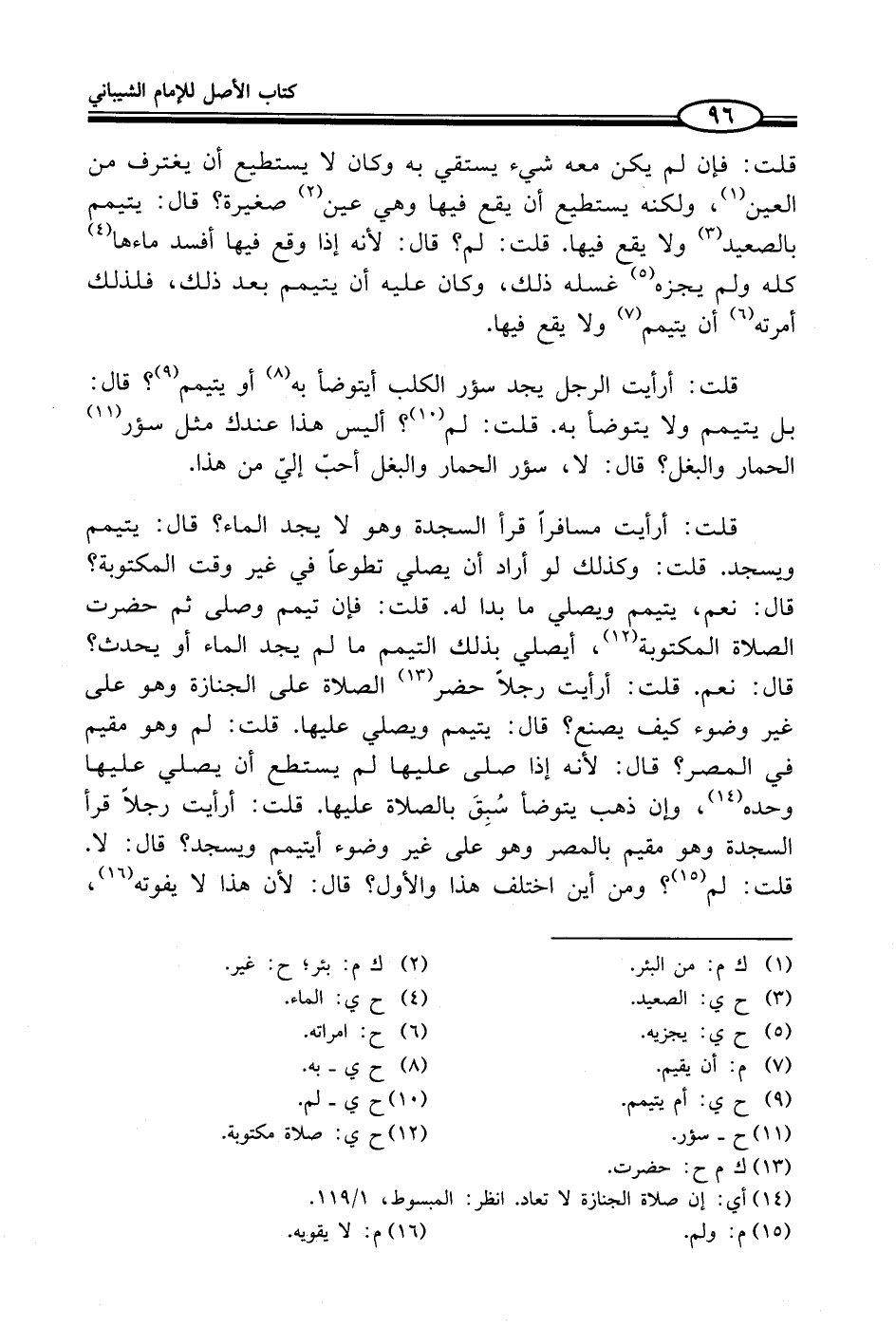 قلت: أرأيت مسافراً قرأ السجدة وهو لا يجد الماء؟ قال: يتيمم ويسجد. قلت: وكذلك لو أراد أن يصلي تطوعاً في غير وقت المكتوبة؟ قال: نعم، يتيمم ويصلي ما بدا له. قلت: فإن تيمم وصلى ثم حضرت الصلاة المكتوبة (¬12)، أيصلي بذلك التيمم ما لم يجد الماء أو يحدث؟ قال: نعم. قلت: أرأيت رجلاً حضر (¬13) الصلاة على الجنازة وهو على غير وضوء كيف يصنع؟ قال: يتيمم ويصلي عليها. قلت: لم وهو مقيم في المصر؟ قال: لأنه إذا صلى عليها لم يستطع أن يصلي عليها وحده (¬14)، وإن ذهب يتوضأ سُبِقَ بالصلاة عليها. قلت: أرأيت رجلاً قرأ السجدة وهو مقيم بالمصر وهو على غير وضوء أيتيمم ويسجد؟ قال: لا. قلت: لم (¬15)؟ ومن أين اختلف هذا والأول؟ قال: لأن هذا لا يفوته (¬16)،