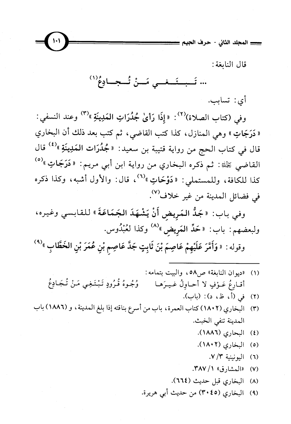 وفي (كتاب الصلاة) (¬2): "إِذَا رَأى جُدُرَاتِ المَدِينَةِ" (¬3) وعند النسفي: "دَرَجَاتِ" وهي المنازل، كذا كتب القاضي، ثم كتب بعد ذلك أن البخاري قال في كتاب الحج من رواية قتيبة بن سعيد: "جُدُرَات المَدِينَةِ" (¬4) قال القاضي - رحمه الله -: ثم ذكره البخاري من رواية ابن أبي مريم: "دَرَجَاتِ" (¬5) كذا للكافة، وللمستملي: "دَوْحَاتِ" (¬6)، قال: والأول أشبه، وكذا ذكره في فضائل المدينة من غير خلاف (¬7).