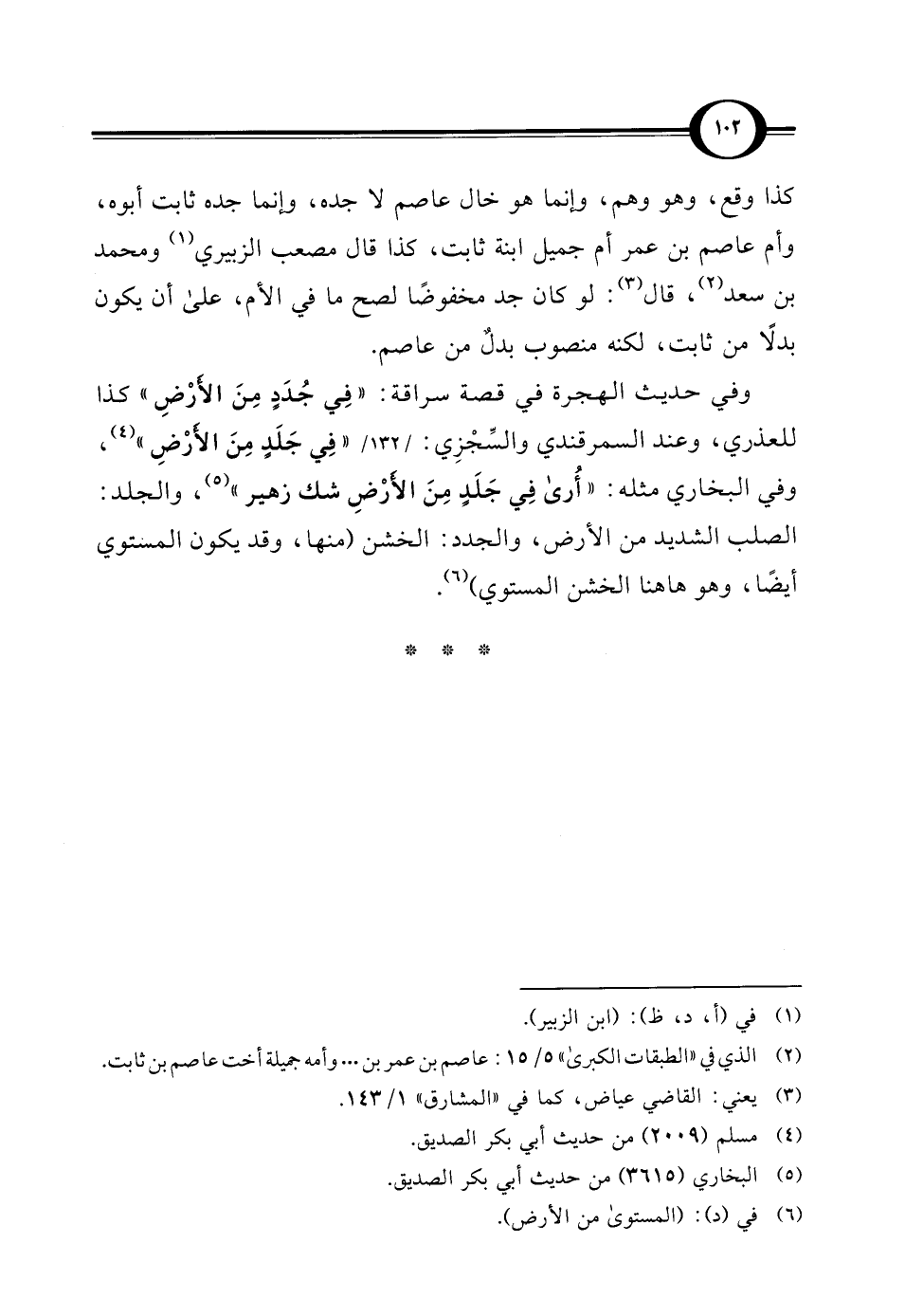 وفي حديث الهجرة في قصة سراقة: "في جُدَدٍ مِنَ الأَرْضِ" كذا للعذري، وعند السمرقندي والسِّجْزِي: "في جَلَدٍ مِنَ الأَرْضِ" (¬4)، وفي البخاري مثله: "أُرى في جَلَدٍ مِنَ الأَرْضِ شك زهير" (¬5)، والجلد: الصلب الشديد من الأرض، والجدد: الخشن (منها، وقد يكون المستوي أيضًا، وهو هاهنا الخشن المستوي) (¬6).