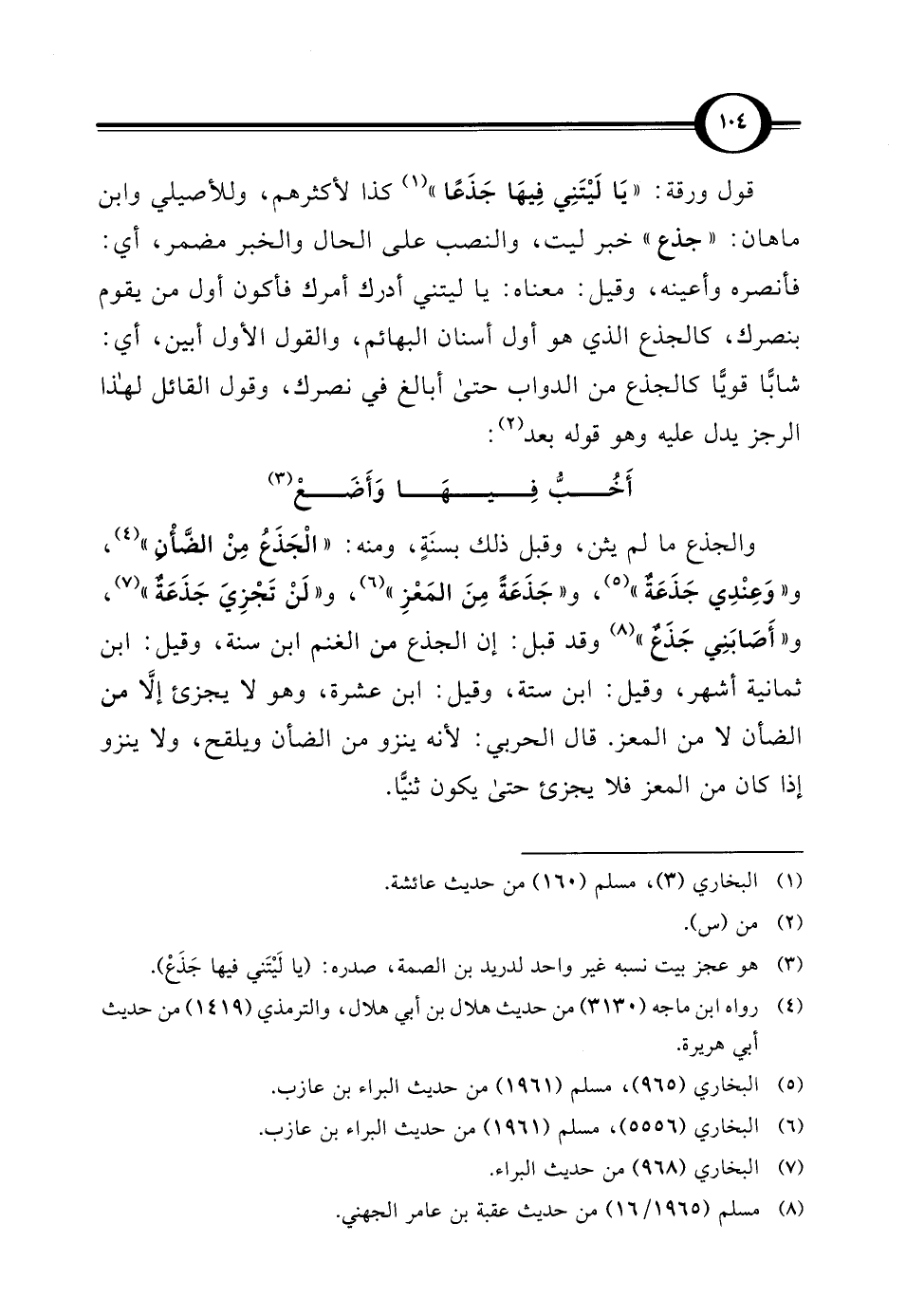 (¬3) هو عجز بيت نسبه غير واحد لدريد بن الصمة، صدره: (يا لَيْتَني فيها جَذَعْ).