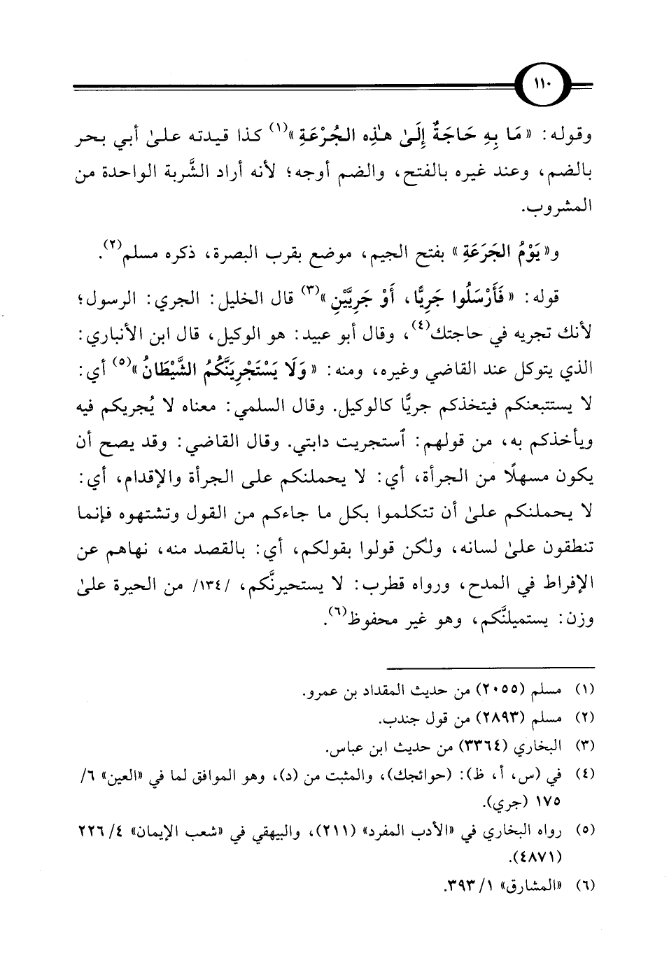وقوله: "مَا بِهِ حَاجَةٌ إلى هذِه الجُرْعَةِ" (¬1) كذا قيدته على أبي بحر بالضم، وعند غيره بالفتح، والضم أوجه؛ لأنه أراد الشَّربة الواحدة من المشروب.
