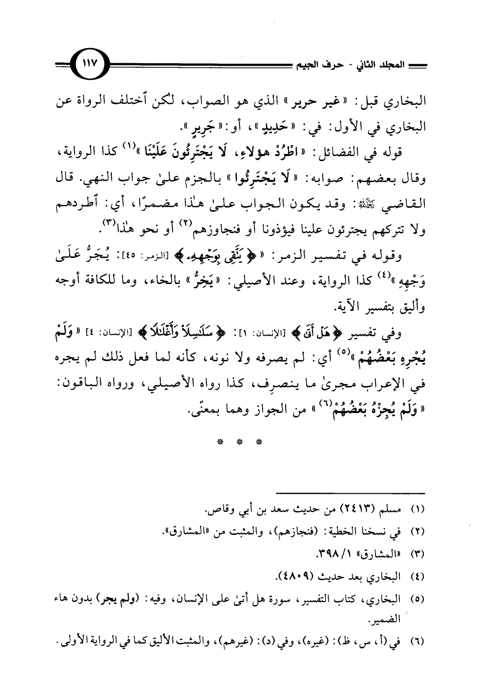 (¬5) البخاري، كتاب التفسير، سورة هل أتى على الإنسان، وفيه: (ولم يجر) بدون هاء الضمير.
