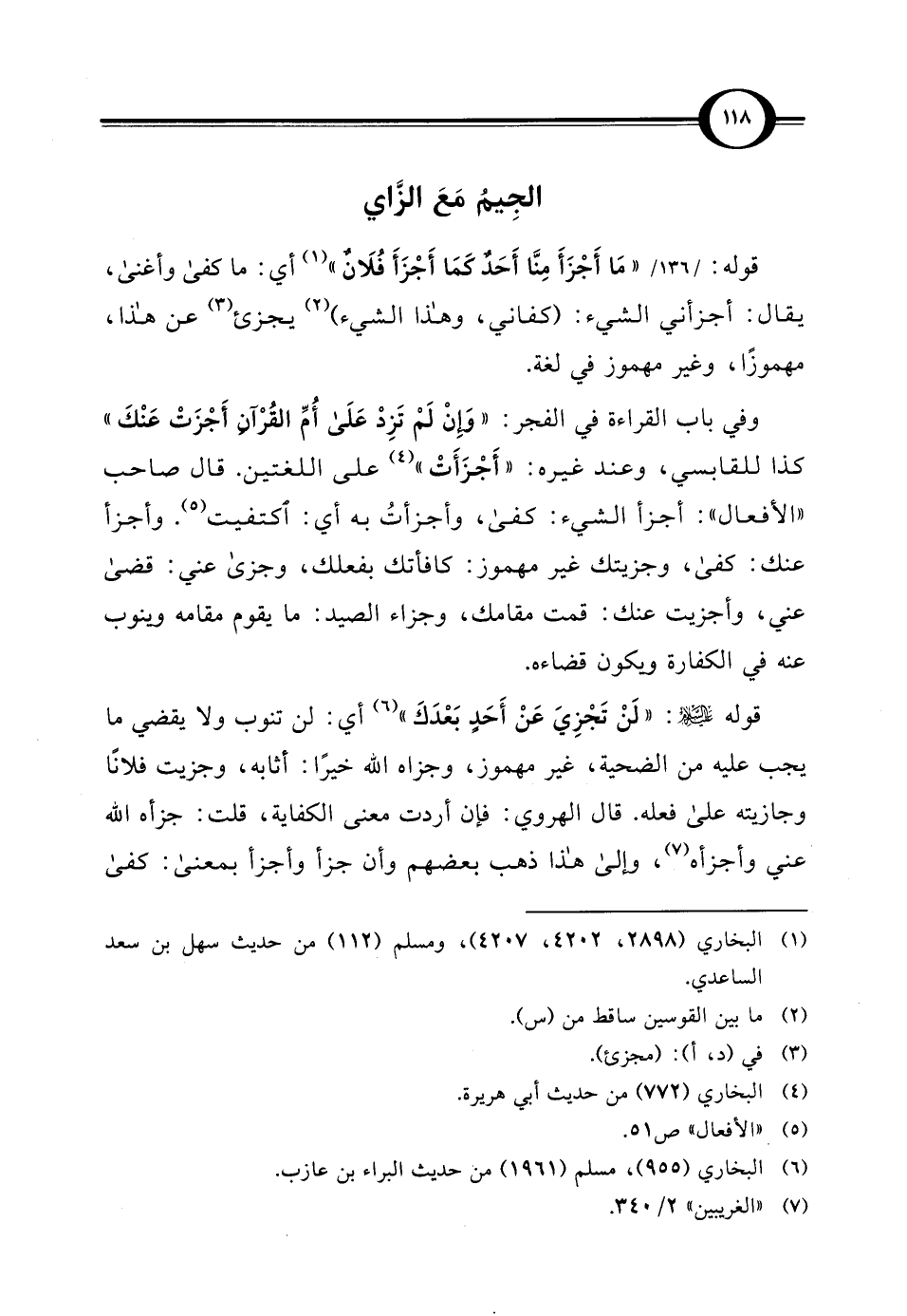 قوله - عليه السلام -: "لَنْ تَجْزِيَ عَنْ أَحَدٍ بَعْدَكَ" (¬6) أي: لن تنوب ولا يقضي ما يجب عليه من الضحية، غير مهموز، وجزاه الله خيرًا: أثابه، وجزيت فلانًا وجازيته على فعله. قال الهروي: فإن أردت معنى الكفاية، قلت: جزأه الله عني وأجزأه (¬7)، وإلى هذا ذهب بعضهم وأن جزأ وأجزأ بمعنى: كفى