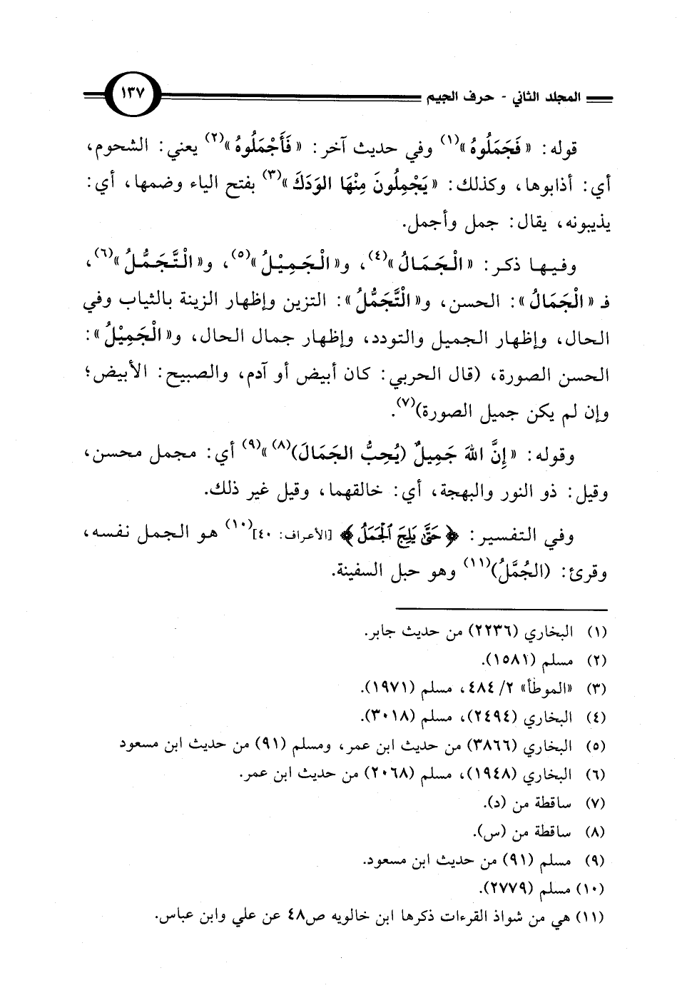 وفيها ذكر: "الْجَمَالُ" (¬4)، و"الْجَمِيْلُ" (¬5)، و"الْتَّجَمُّلُ" (¬6)، فـ "الْجَمَالُ": الحسن، و"الْتَّجَمُّلُ": التزين وإظهار الزينة بالثياب وفي الحال، وإظهار الجميل والتودد، وإظهار جمال الحال، و"الْجَمِيْلُ": الحسن الصورة، (قال الحربي: كان أبيض أو آدم، والصبيح: الأبيض؛ وإن لم يكن جميل الصورة) (¬7).