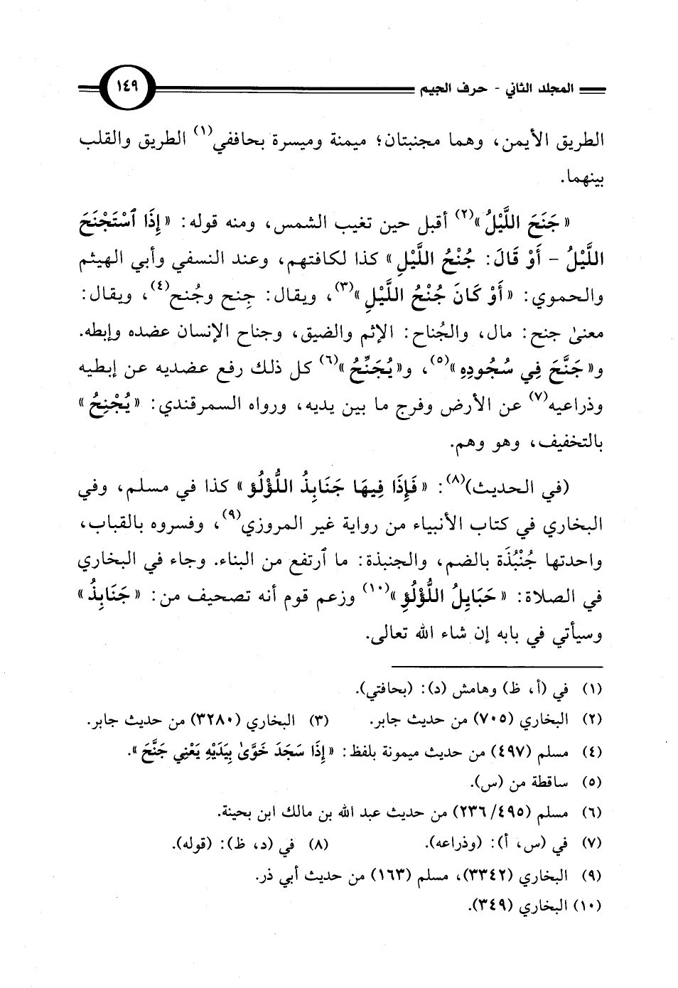 "جَنَحَ اللَّيْلُ" (¬2) أقبل حين تغيب الشمس، ومنه قوله: "إِذَا اسْتَجْنَحَ اللَّيْلُ - أَوْ قَالَ: جُنْحُ اللَّيْلِ" كذا لكافتهم، وعند النسفي وأبي الهيثم والحموي: "أَوْ كَانَ جُنْحُ اللَّيْلِ" (¬3)، ويقال: جِنح وجُنح (¬4)، ويقال: معنى جنح: مال، والجُناح: الإثم والضيق، وجناح الإنسان عضده وإبطه.