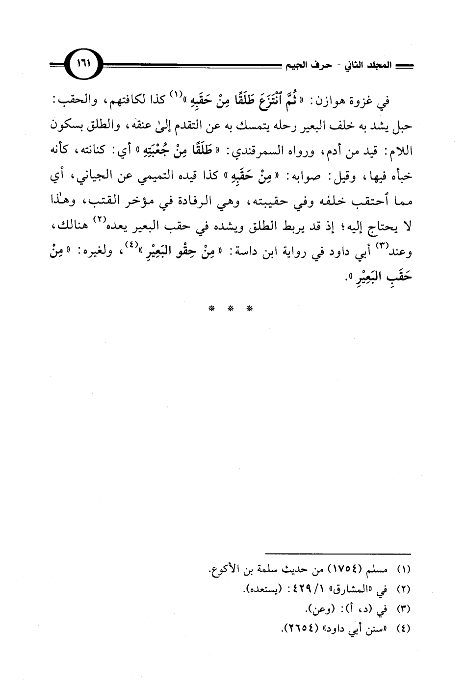 في غزوة هوازن: "ثُمَّ انْتَزَعَ طَلَقًا مِنْ حَقَبِهِ" (¬1) كذا لكافتهم، والحقب: حبل يشد به خلف البعير رحله يتمسك به عن التقدم إلى عنقه، والطلق بسكون اللام: قيد من أدم، ورواه السمرقندي: "طَلَقًا مِنْ جُعْبَتِهِ" أي: كنانته، كأنه خبأه فيها، وقيل: صوابه: "مِنْ حَقَبِهِ" كذا قيده التميمي عن الجياني، أي مما احتقب خلفه وفي حقيبته، وهي الرفادة في مؤخر القتب، وهذا لا يحتاج إليه؛ إذ قد يربط الطلق ويشده في حقب البعير بعده (¬2) هنالك، وعند (¬3) أبي داود في رواية ابن داسة: "مِنْ حِقْو البَعِيْرِ" (¬4)، ولغيره: "مِنْ حَقَبِ البَعِيْرِ".