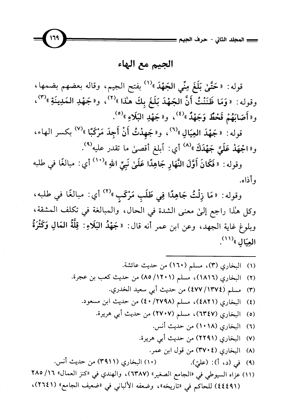 وقوله: "مَا زِلْتُ جَاهِدًا في طَلَبِ مَرْكَبٍ" (2) أي: مبالغًا في طلبه، وكل هذا راجع إلى معنى الشدة في الحال، والمبالغة في تكلف المشقة، وبلوغ غاية الجهد، وعن ابن عمر أنه قال: "جَهْدُ البَلَاءِ: قِلَّةُ المَالِ وَكَثْرَةُ العِيَالِ" (¬11).