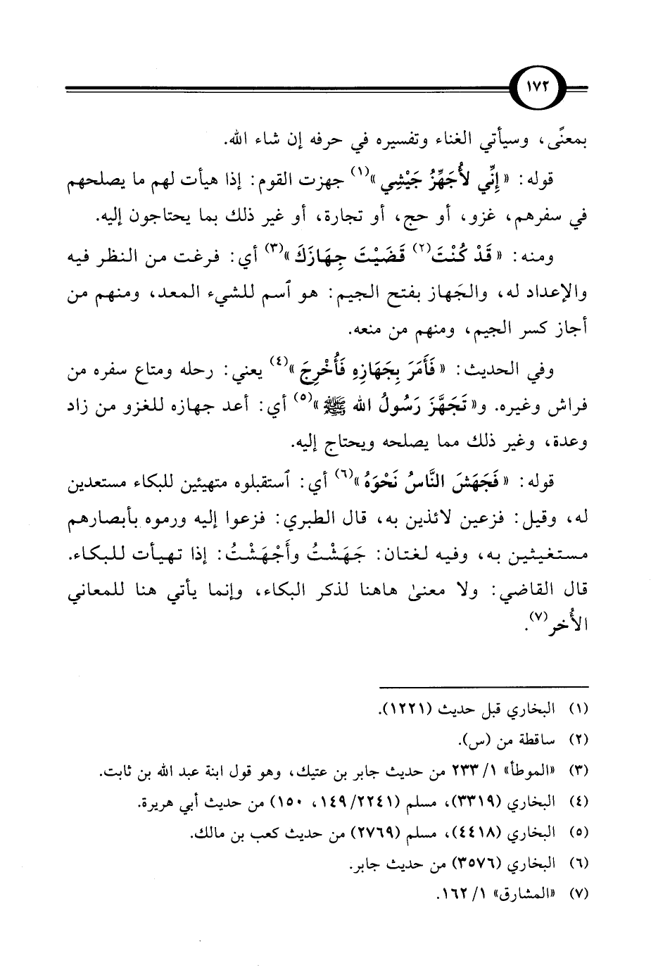 وفي الحديث: "فَأَمَرَ بِجَهَازِهِ فَأُخْرِجَ" (¬4) يعني: رحله ومتاع سفره من فراش وغيره. و"تَجَهَّزَ رَسُولُ الله - صلى الله عليه وسلم - " (¬5) أي: أعد جهازه للغزو من زاد وعدة، وغير ذلك مما يصلحه ويحتاج إليه.