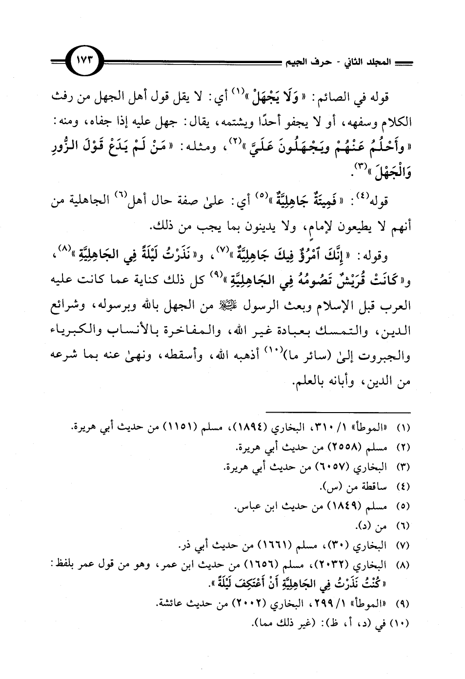 وقوله: "إِنَّكَ امْرُؤٌ فِيكَ جَاهِلِيَّةٌ" (¬7)، و"نَذَرْتُ لَيْلَةً في الجَاهِلِيَّةِ" (¬8)، و"كانَتْ قُرَيْشٌ تَصُومُهُ في الجَاهِلِيَّةِ" (¬9) كل ذلك كناية عما كانت عليه العرب قبل الإِسلام وبعث الرسول عليه السلام من الجهل بالله وبرسوله، وشرائع الدين، والتمسك بعبادة غير الله، والمفاخرة بالأنساب والكبرياء والجبروت إلى (سائر ما) (¬10) أذهبه الله، وأسقطه، ونهى عنه بما شرعه من الدين، وأبانه بالعلم.