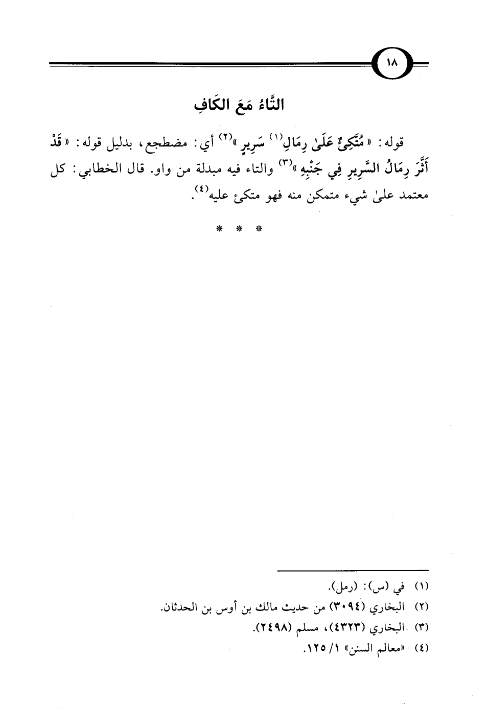 قوله: "مُتَكِئٌ عَلَى رِمَالِ (¬1) سَرِيرٍ" (¬2) أي: مضطجع، بدليل قوله: "قَدْ أَثَّرَ رِمَالُ السَّرِيرِ في جَنْبِهِ" (¬3) والتاء فيه مبدلة من واو. قال الخطابي: كل معتمد على شيء متمكن منه فهو متكئ عليه (¬4).