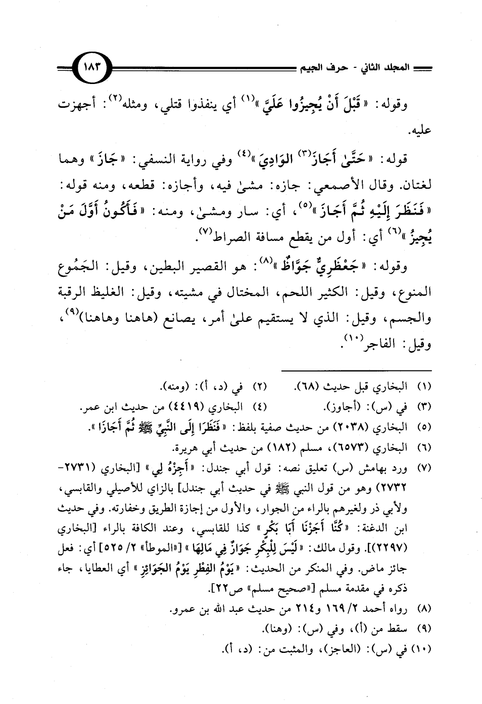 (¬7) ورد بهامش (س) تعليق نصه: قول أبي جندل: "أَجِزْهُ لِي" [البخاري (2731 - 2732) وهو من قول النبي - صلي الله عليه وسلم - في حديث أبي جندل] بالزاي للأصيلي والقابسي، ولأبي ذر ولغيرهم بالراء من الجوار، والأول من إجازة الطريق وخفارته. وفي حديث ابن الدغنة: "كُنَّا أَجَزْنَا أَبَا بَكْرٍ" كذا للقابسي، وعند الكافة بالراء [البخاري (2297)]. وقول مالك: "لَيْسَ لِلْبِكْرِ جَوَازٌ في مَالِهَا" ["الموطأ" 2/ 525] أي: فعل جائز ماض. وفي المنكر من الحديث: "يَوْمُ الفِطْرِ يَوْمُ الجَوَائِزِ" أي العطايا، جاء ذكره في مقدمة مسلم ["صحيح مسلم" ص 22].