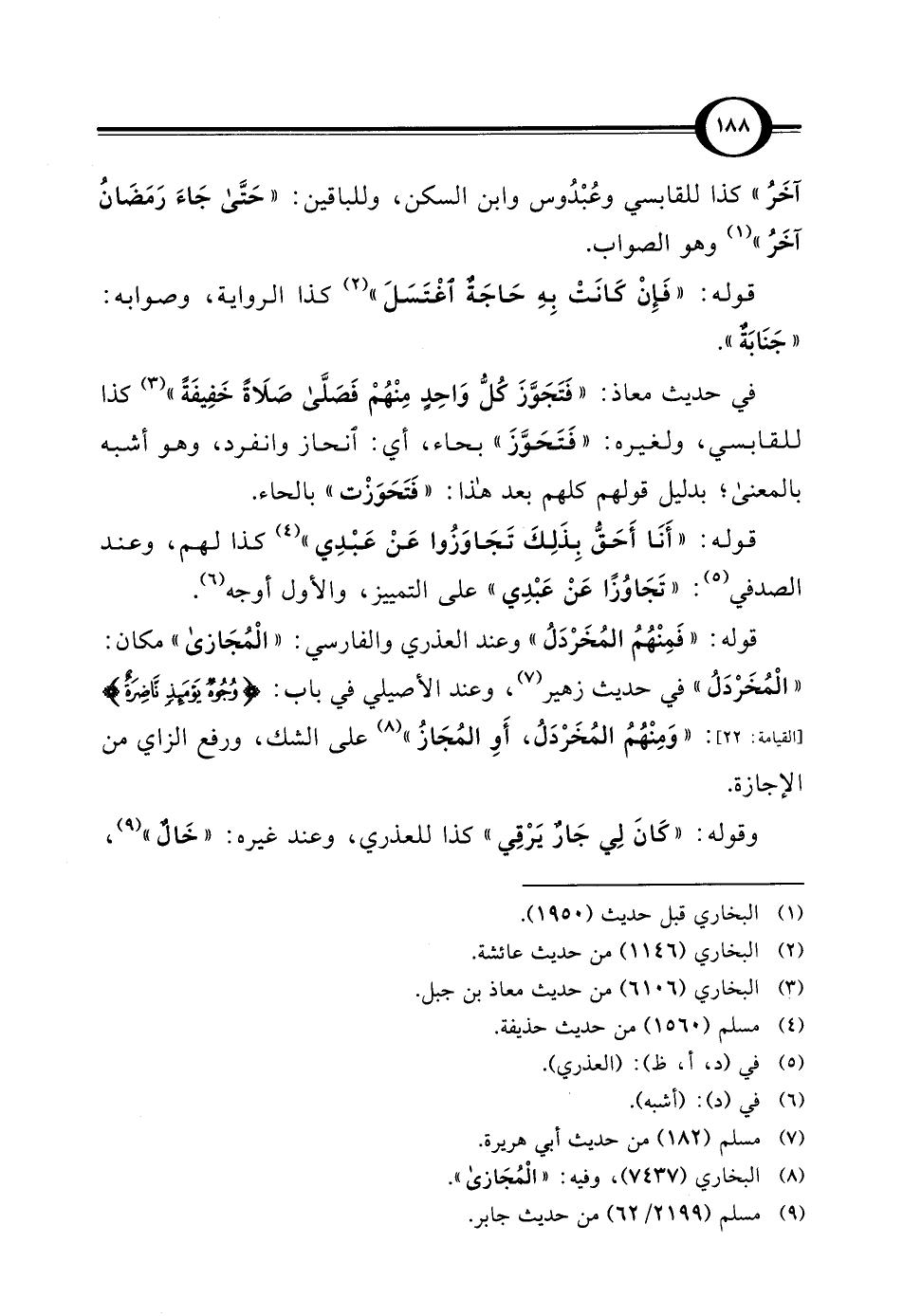 في حديث معاذ: "فَتَجَوَّزَ كُلُّ وَاحِدٍ مِنْهُمْ فَصَلَّى صَلَاةً خَفِيفَةً" (¬3) كذا للقابسي، ولغيره: "فَتَحَوَّزَ" بحاء، أي: انحاز وانفرد، وهو أشبه بالمعنى، بدليل قولهم كلهم بعد هذا: "فَتَحَوَزْت" بالحاء.