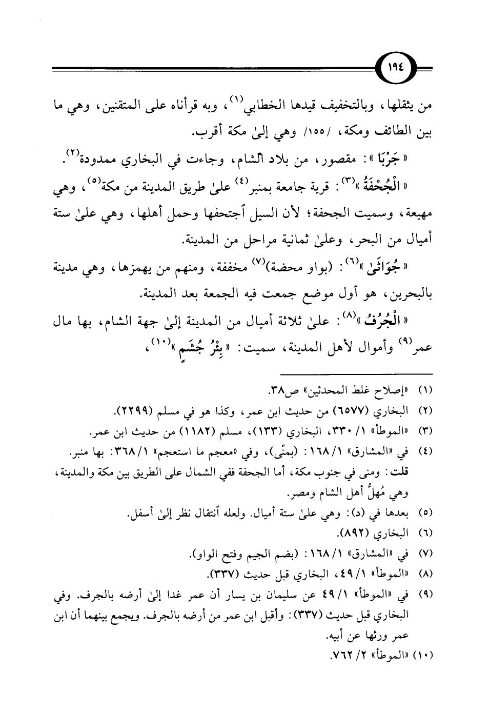 (¬9) في "الموطأ" 1/ 49 عن سليمان بن يسار أن عمر غدا إلى أرضه بالجرف. وفي البخاري قبل حديث (337): وأقبل ابن عمر من أرضه بالجرف. ويجمع بينهما أن ابن عمر ورثها عن أبيه.