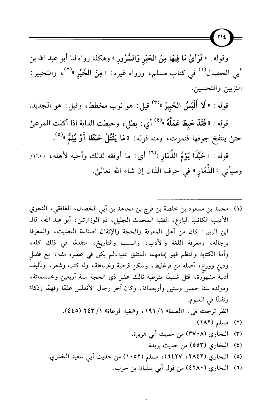 (¬1) محمَّد بن مسعود بن خلصة بن فرج بن مجاهد بن أبي الخصال، الغافقي، النحوي الأديب الكاتب البارع، الفقيه المحدث الجليل، ذو الوزارتين، أبو عبد الله، قال ابن الزبير: كان من أهل المعرفة والحجة والإتقان لصناعة الحديث، والمعرفة برجاله، ومعرفة اللغة والأدب، والنسب والتاريخ, متقدمًا في ذلك كله، وأما الكتابة والنظم فهو إمامهما المتفق عليه، لم يكن في عصره مثله، مع فضلٍ ودينٍ وورعٍ، أصله من فرغليط، وسكن قرطبة وغرناطة، وله كتب وشعر، وتآليف أدبية مشهورة، قتل شهيدًا بقرطبة ثالث عشر ذي الحجة سنة أربعين وخمسمائة، ومولده سنة خمس وستين وأربعمائة، وكان آخر رجال الأندلس علمًا وفهمًا وذكاءً وتفننًا في العلوم. انظر ترجمته في: "الصلة" 1/ 191، و"بغية الوعاة" 1/ 243 (445).