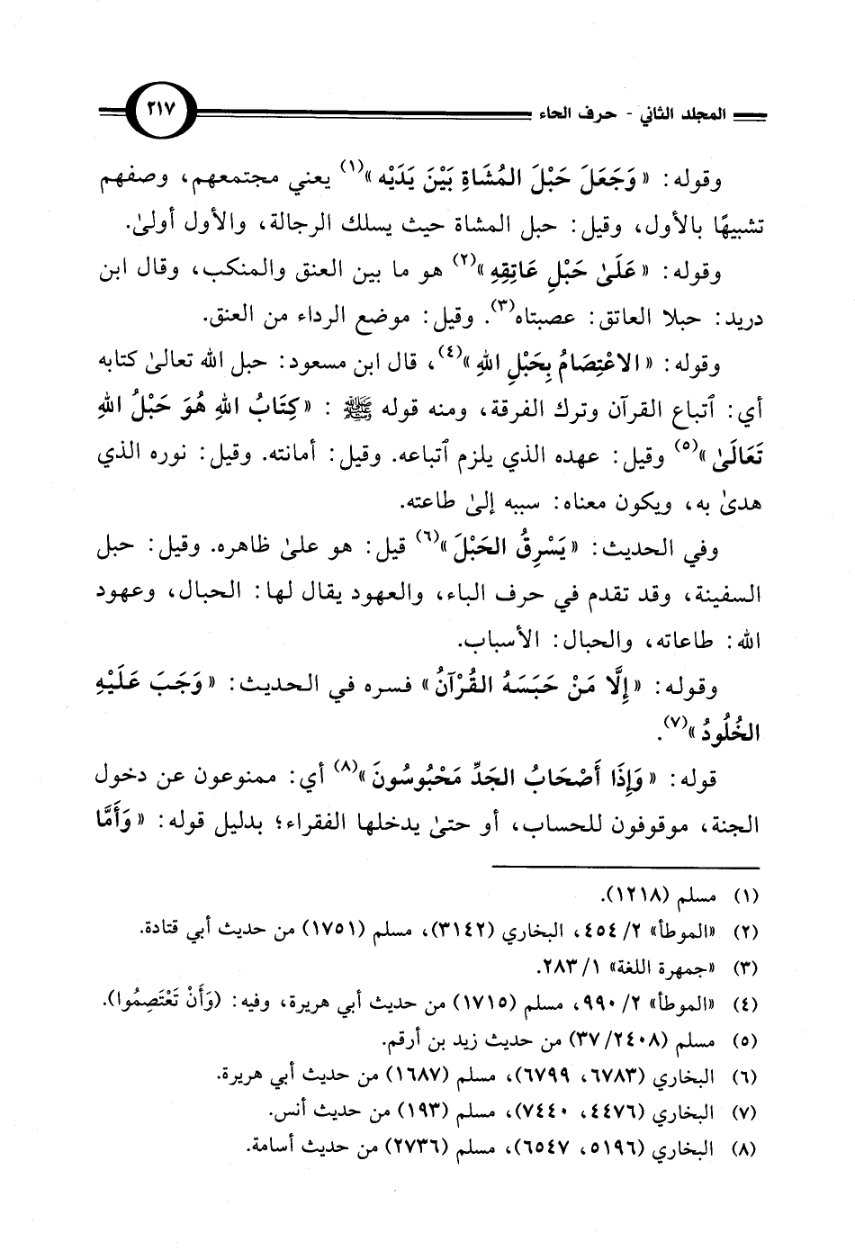 وفي الحديث: "يَسْرِقُ الحَبْلَ" (¬6) قيل: هو على ظاهره. وقيل: حبل السفينة، وقد تقدم في حرف الباء، والعهود يقال لها: الحبال، وعهود الله: طاعاته، والحبال: الأسباب.